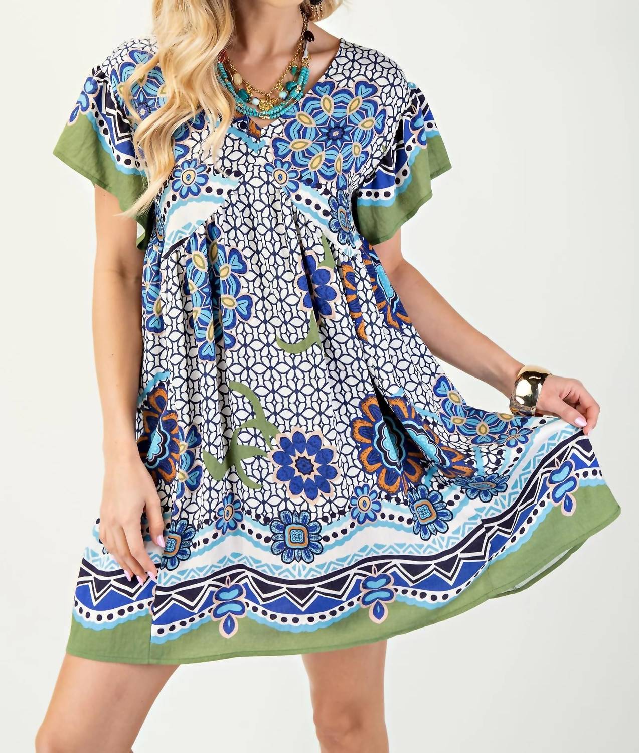 The perfect mini dress for those warmer months. Step into summer with the Printed V-neck Mini Dress by GiGiO, perfect for a beach day in charming blue and green floral print. This boho chic piece features short sleeves and an empire waist silhouette, crafted from 83% Rayon and 17% Nylon for a breezy feel. Designed with convenience in mind, the dress offers a pull-on closure complemented by a self-tie back for added style. Easy to care for, simply machine wash as needed.