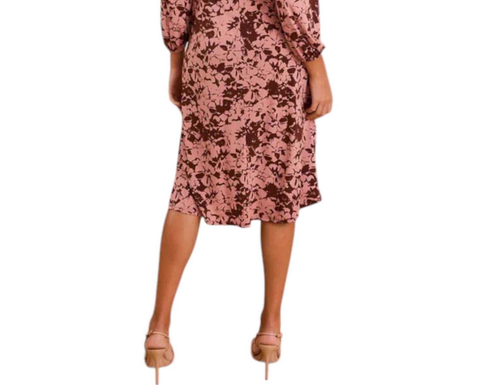 Faux wrap midi dress. Flattering silhouette. Wrinkle-free design for easy wear. 95% Polyester, 5% Spandex for comfort and stretch. Made in Guatemala.