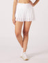 Transform your activewear collection with the Alley Skirt by Glyder, a chic and functional piece perfect for athleisure and fitness settings. This women's mini skirt, available in a fresh white solid pattern, features a flattering waistband with a sculpting v-back and practical built-in shorts with a pocket. With a convenient pull-on closure and a sporty 14" length, this skirt is designed for style and action. The brand suggests sizing down for the best fit, ensuring a sleek and comfortable silhouette. Model shown is 5'10" with measurements 32" chest, 26" waist, and 37" hips.