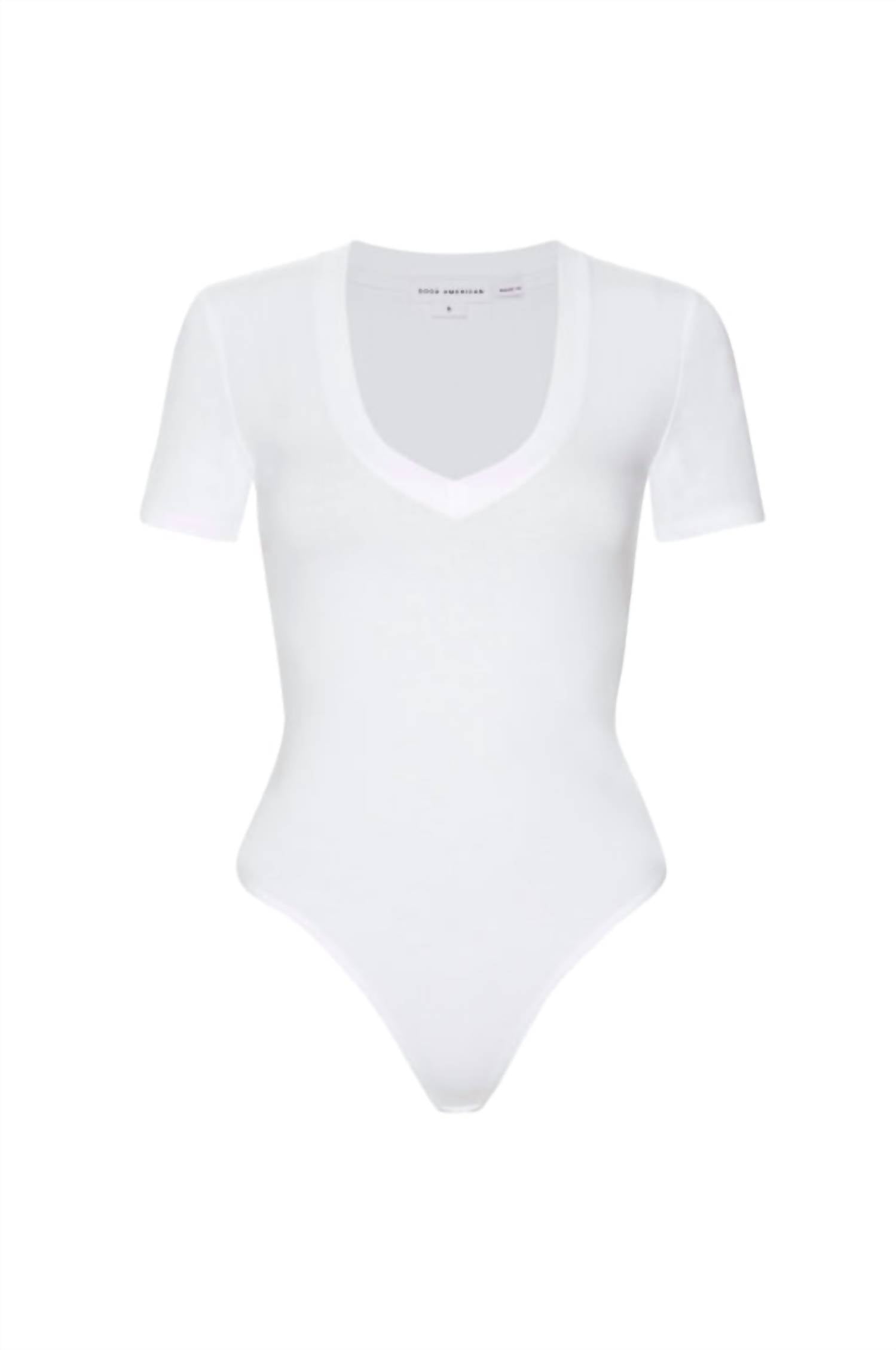 Meet the Women's Super Stretch Deep V-neck Bodysuit by Good American, a must-have for bodysuit enthusiasts. This white, short sleeve bodysuit features a deep V-neckline, crafted from a comfortable and stretchy cotton blend. Composition: 94% Cotton, 6% Spandex. Care: Machine wash and tumble dry for effortless maintenance. Ideal for spring vacations and minimalist wardrobes.