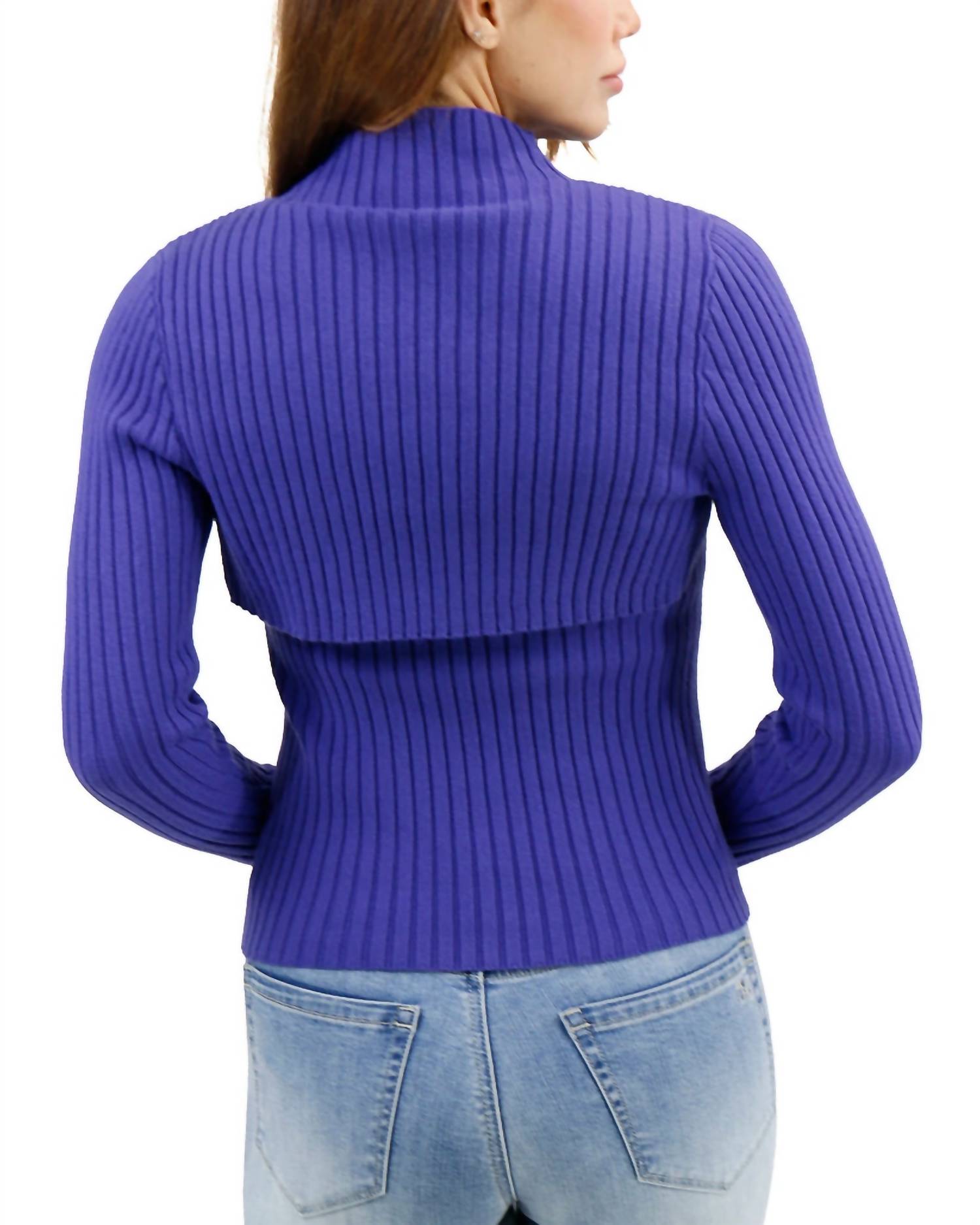 This 2-piece ribbed shrug sweater is made with luxuriously soft, ribbed knit yarn. The sweater features an eye-catching top with a cut-out illusion at the neckline. Made from 50% viscose, 28% polyester, and 22% polyamide. Length: 21" (size XS). Machine wash cold, reshape and dry flat.