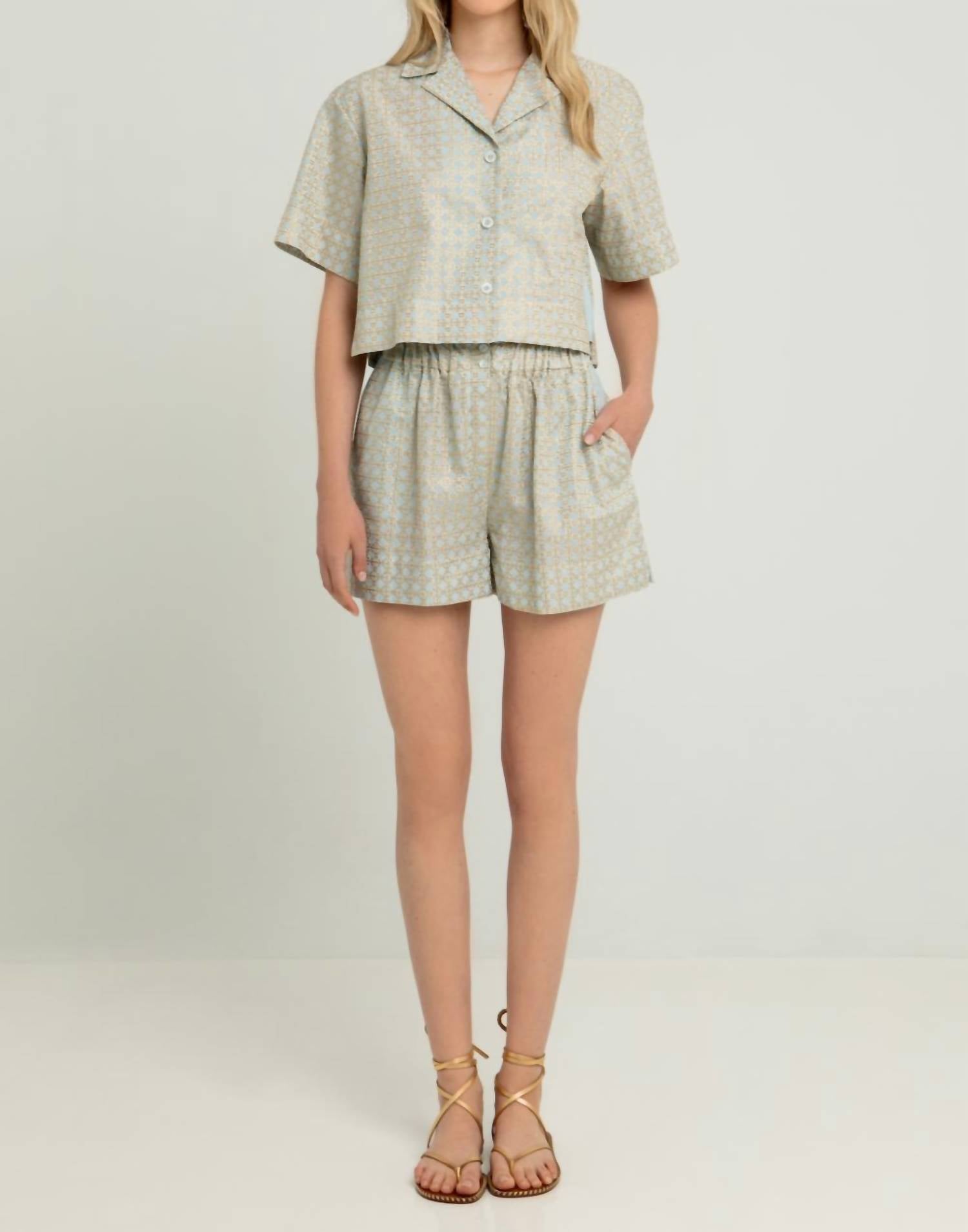 Introducing the Greek Archaic Kori Cross Elastic Waistband Shorts, a streetwear staple in an eye-catching Ciel-Gold hue. These high waist shorts are crafted from 100% cotton for ultimate comfort and feature a pull-on closure for effortless wear, perfect for summer and holiday parties. Patterned for a trendy look, these shorts fit true to size and are a versatile addition to any wardrobe. Care: Machine wash and tumble dry for easy maintenance.