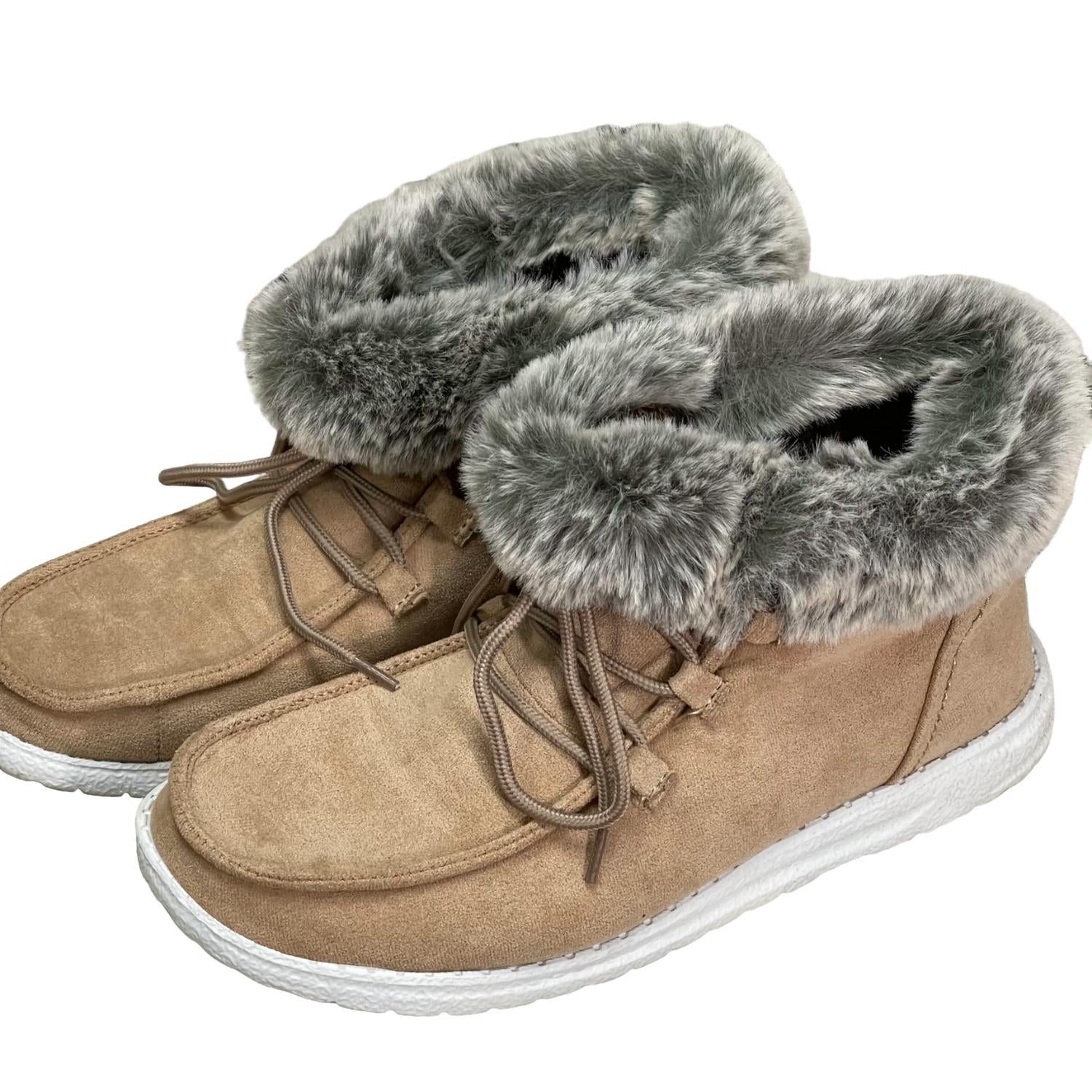 Say hello to the perfect, most versatile boot. The ankle height makes this style easily transition from day to night. Wear them with your favorite skinny jeans and tee for a more laid back look, or pair them with your favorite mini dress and jacket for a night out on the town.This bootie is true to size and offers a snap down or flip up feature. It’s fuzzy fleece lined, slip-on style, with tie shoes and a padded insole. Made from lightweight suede canvas with a soft foam insole for added comfort.