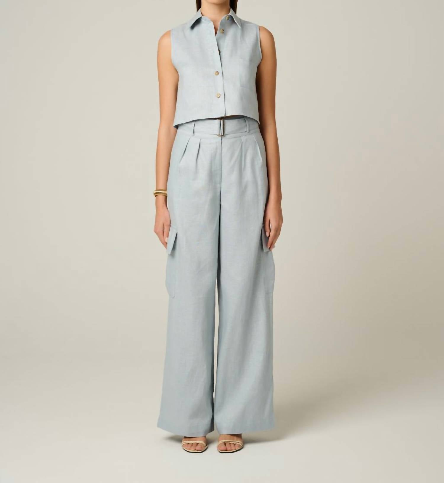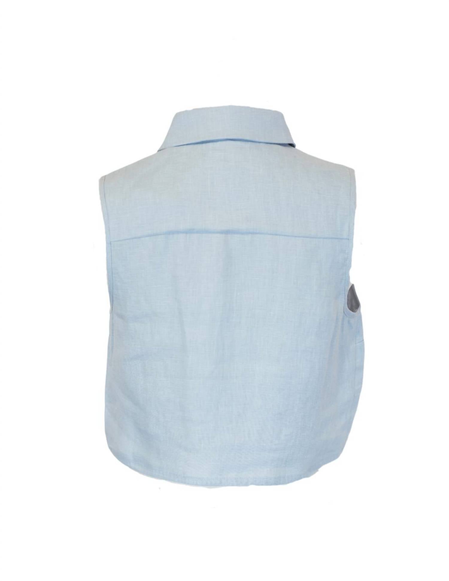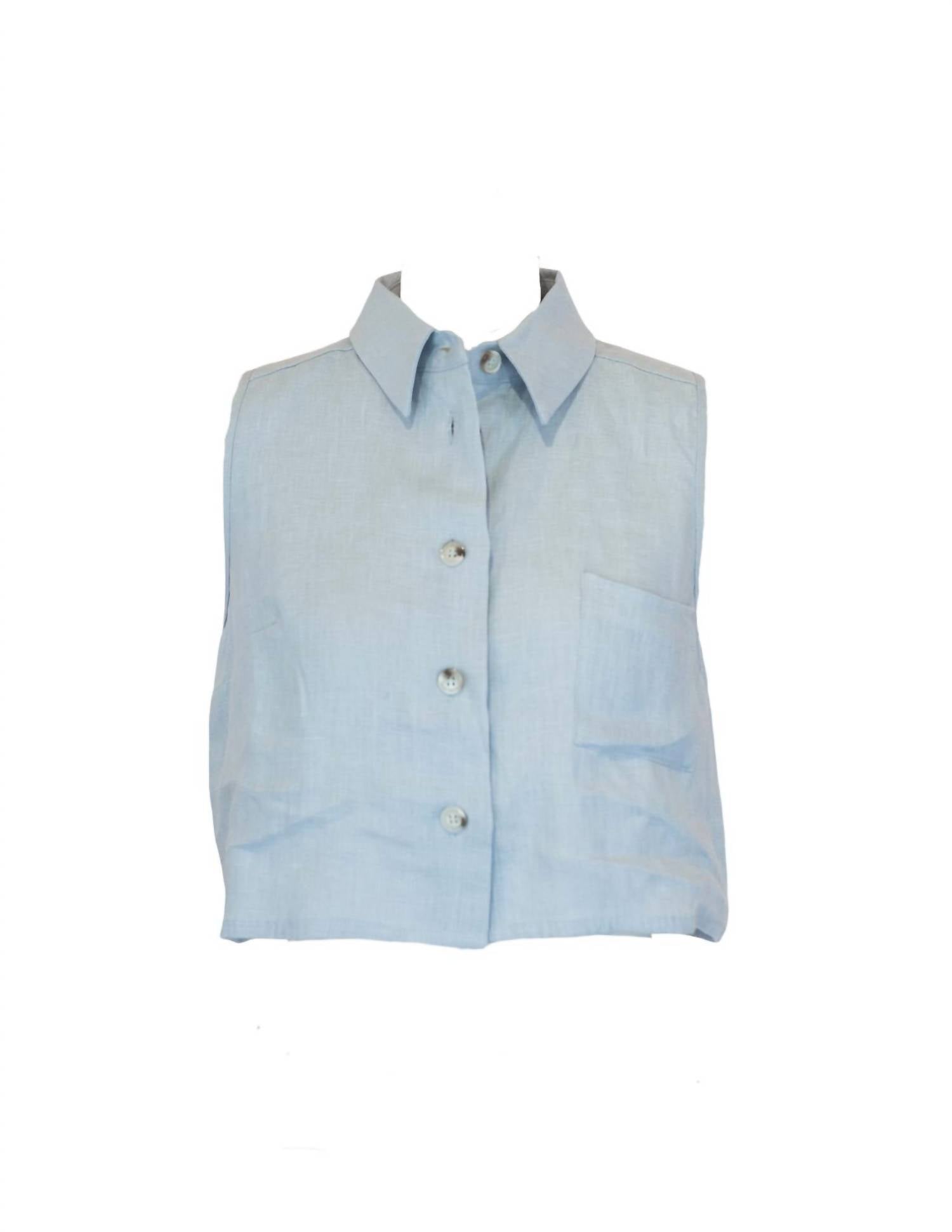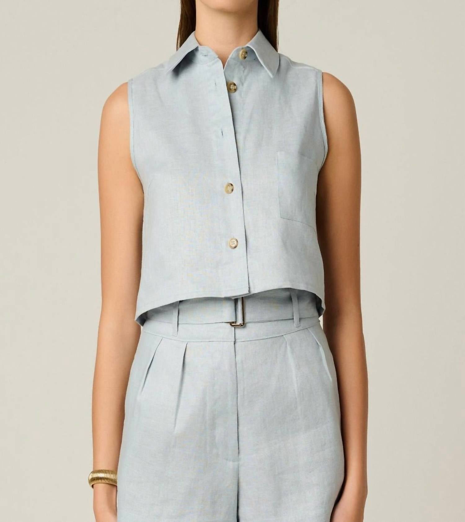 Perfectly tailored and soft to the touch. Elevate your wardrobe with the Hevron Katja Top in Dusty Blue, an ideal choice for both casual brunch and evening outings. This sleeveless, solid button-down shirt, crafted from 100% Linen, offers a cropped fit that flatters effortlessly with its sleek collar. The top embodies spring trends with its workwear appeal, making it a chic choice for holiday gatherings such as Easter. Care for this garment is straightforward with hand wash and line dry instructions.