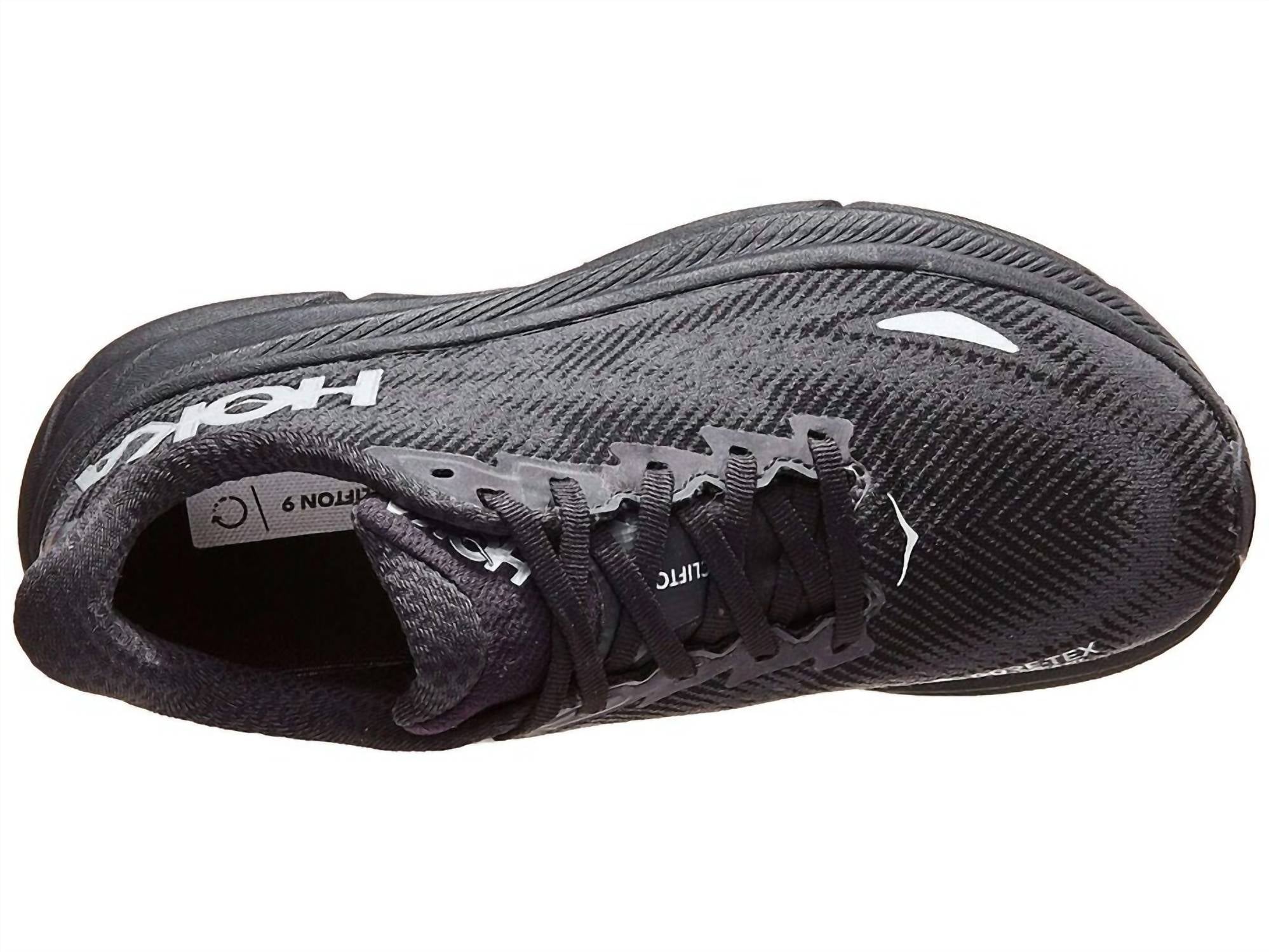 When fashion meets function. Introducing the Women's Clifton 9 Gore-tex Running Shoes by Hoka, designed for comfort and performance in a sleek Black/Black colorway. Featuring a round toe shape, these shoes are tailored for women athletes seeking durable and weather-resistant footwear. Ideal for various athletic activities, these shoes seamlessly blend style and functionality. Perfectly crafted for adults, they promise to enhance your running experience.