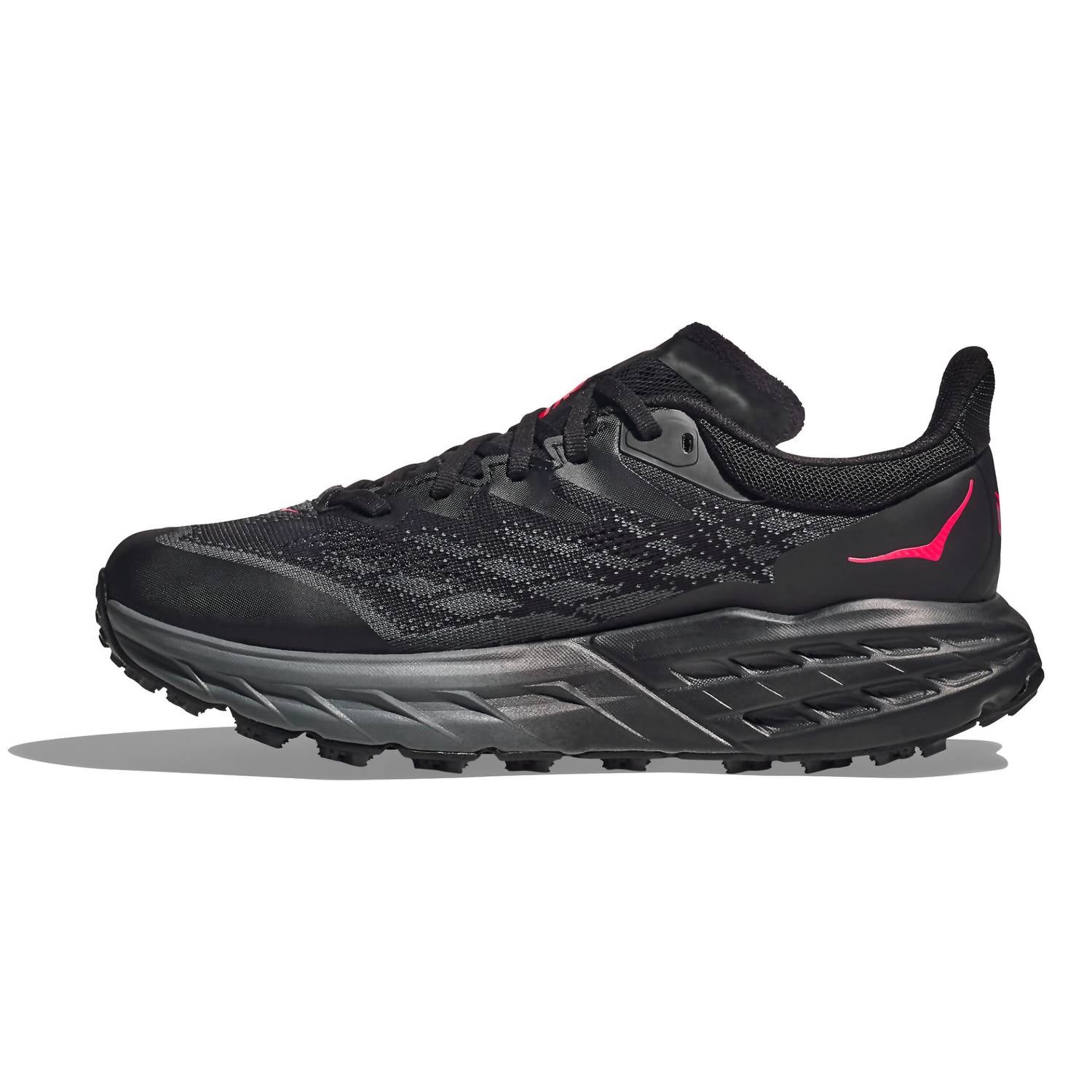 Experience performance-driven design with the Women's Speedgoat 5 GTX Trail Running Shoes by Hoka, presented in sleek Black/Black. Crafted with GORE-TEX and recycled textiles for ultimate weather resistance, these shoes feature a lay-flat gusseted tongue, rubber toe cap, and a reinforced heel collar for enhanced durability. The double-layer jacquard engineered mesh ensures breathability, while the compression-molded EVA midsole and molded EVA sockliner provide exceptional comfort. With a Vibram® Megagrip outsole sporting 5mm lugs, these vegan trail runners, weighing just 272g and with a 4mm heel drop, are tailored for the optimal off-road adventure.