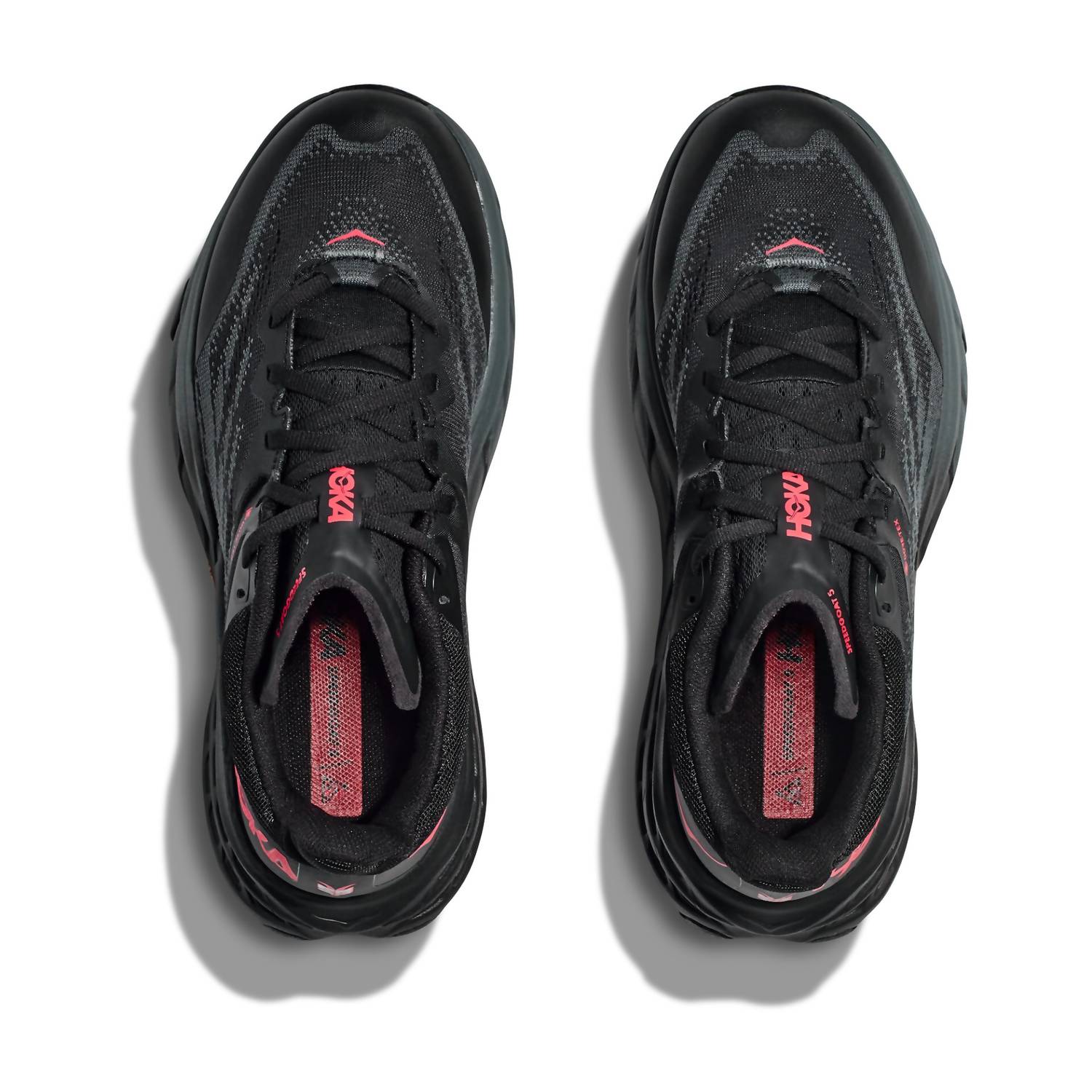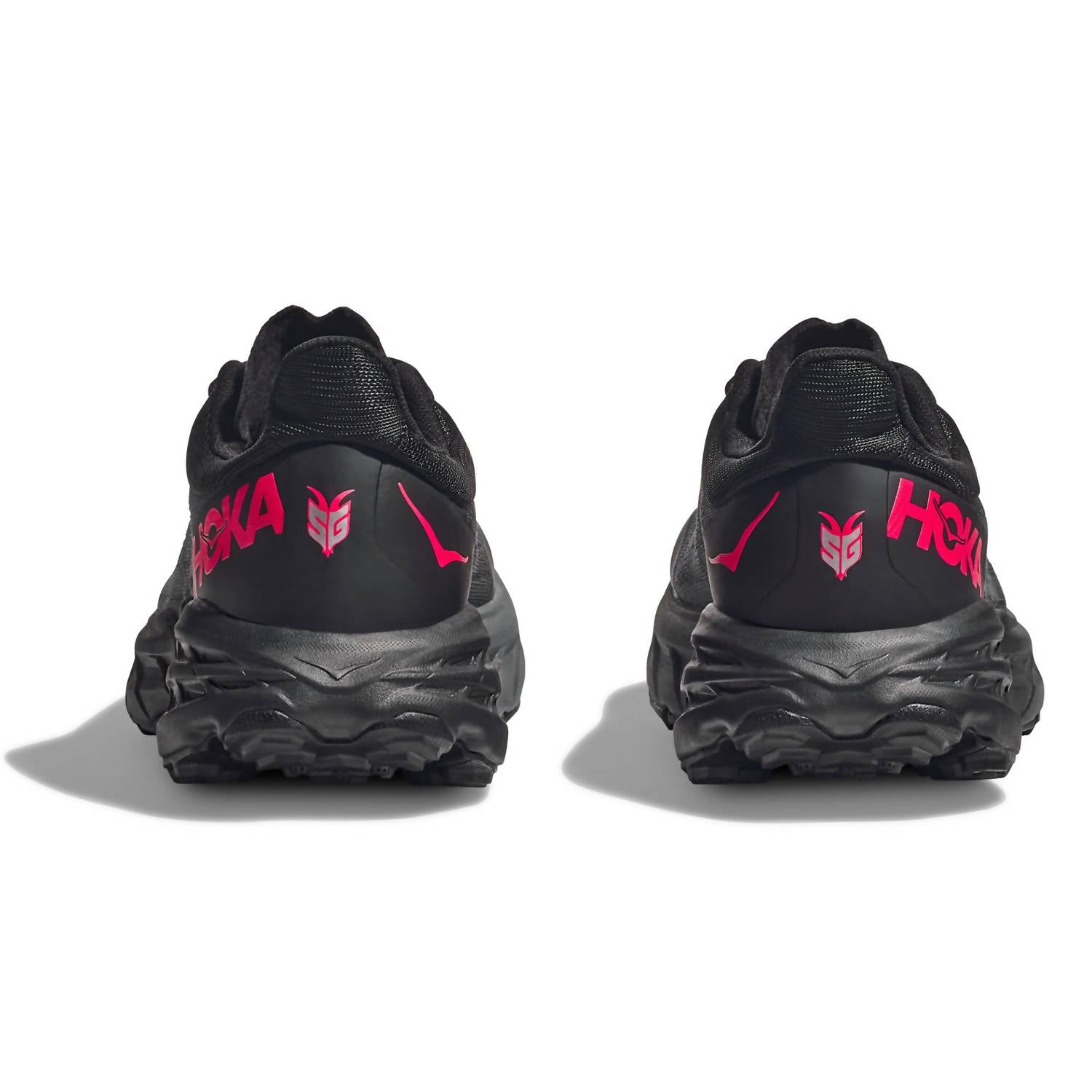 Workout in style with these adorable athletic sneakers. Experience performance-driven design with the Women's Speedgoat 5 GTX Trail Running Shoes by Hoka, presented in sleek Black/Black. Crafted with GORE-TEX and recycled textiles for ultimate weather resistance, these shoes feature a lay-flat gusseted tongue, rubber toe cap, and a reinforced heel collar for enhanced durability. The double-layer jacquard engineered mesh ensures breathability, while the compression-molded EVA midsole and molded EVA sockliner provide exceptional comfort. With a Vibram® Megagrip outsole sporting 5mm lugs, these vegan trail runners, weighing just 272g and with a 4mm heel drop, are tailored for the optimal off-road adventure.