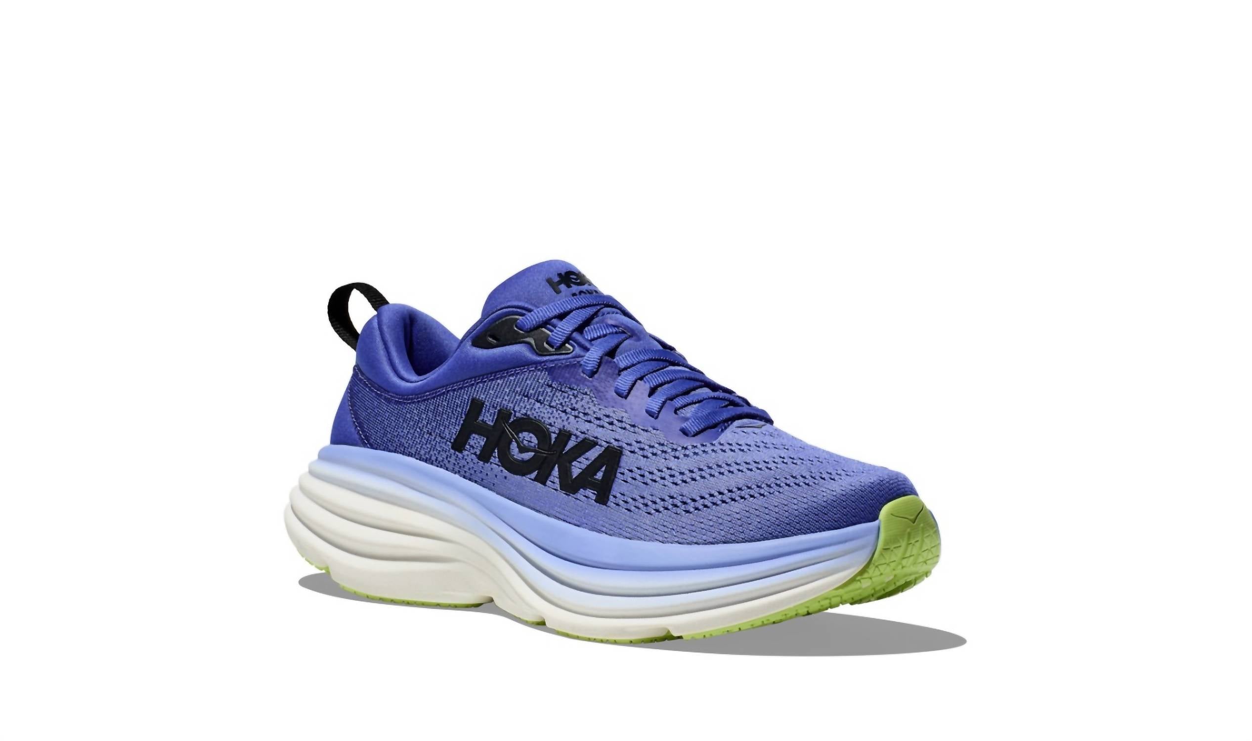 Stylish, comfortable and supportive. These athletic sneakers check all of the boxes. Elevate your everyday runs with the Hoka Women's Bondi 8 Running Shoes in Stellar Blue/Cosmos. Engineered for optimal comfort, they feature a lightweight mesh upper with 50% recycled polyester and a durable Durabrasion rubber outsole. The Ortholite® hybrid sockliner and resilient foam provide unmatched cushioning, while the partially gusseted tongue and heel pull tab ensure a secure fit. Embrace sustainability with materials like the 87% recycled polyester strobel board and 100% recycled polyester sockliner top cloth, all in a stylish vegan-friendly design.