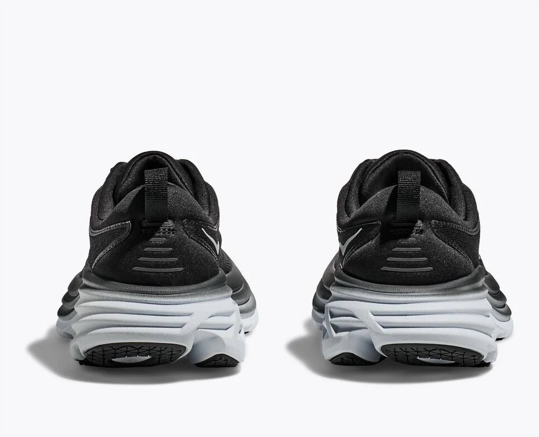 Workout in style with these adorable athletic sneakers. Introducing the Women's Bondi 8 Running Shoes by Hoka, designed for optimal performance and everyday comfort in a striking black and white colorway. These shoes feature a breathable engineered mesh construction and a partially gusseted tongue for a secure fit, enhanced by a convenient heel pull tab. An Ortholite® hybrid sockliner and lightweight, resilient foam provide superior cushioning, while zonal rubber placement and a Durabrasion rubber outsole ensure durability with weight savings. Thoughtfully crafted with sustainability in mind, these sneakers boast a wide toe shape, 50% recycled polyester upper mesh, and 100% recycled polyester sockliner top cloth.