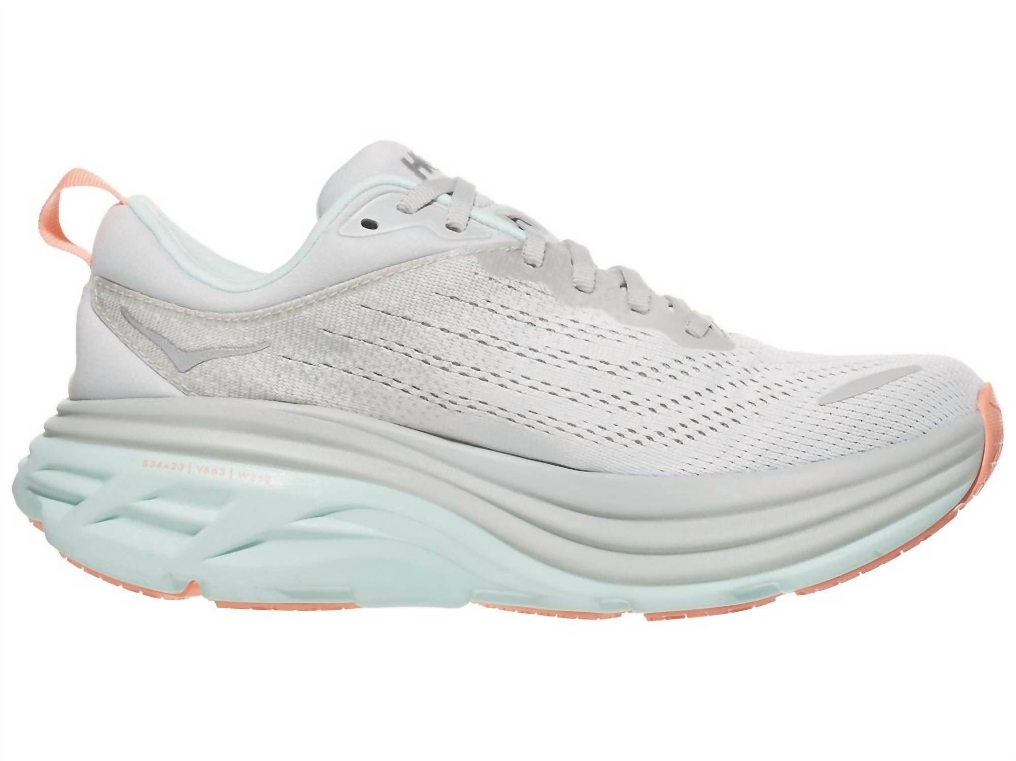 When fashion and function come together seamlessly. Introducing the Women's Bondi 8 Running Sneakers by Hoka, crafted for exceptional comfort and performance. These sneakers feature a lightweight and breathable engineered mesh upper, with a secure fit in a stylish Stardust/Aqua Breeze color. Made from durable polyester, they include a soft EVA midsole designed to enhance cushioning and support. The round toe shape complements the low heel height for a fluid running experience.