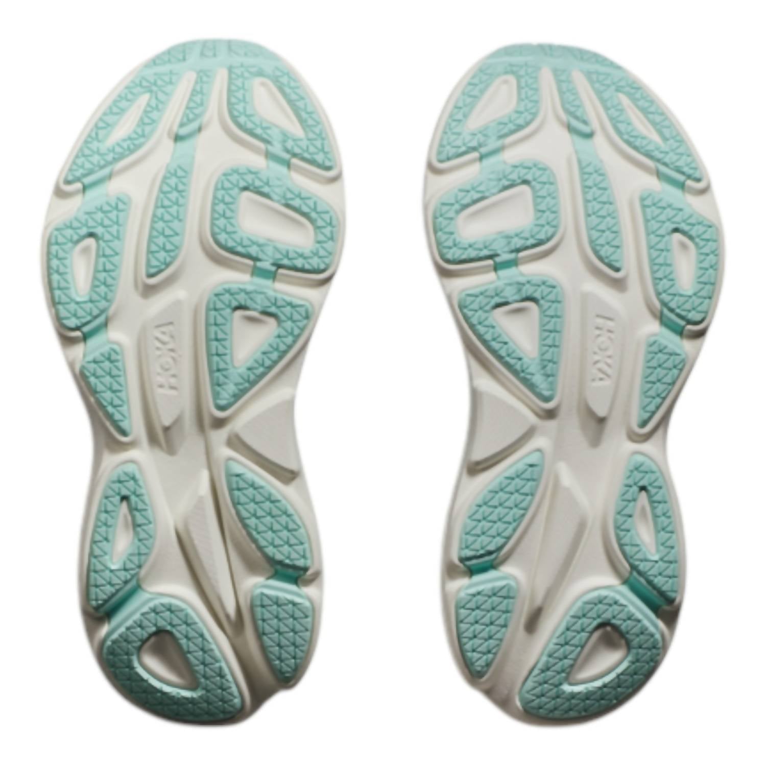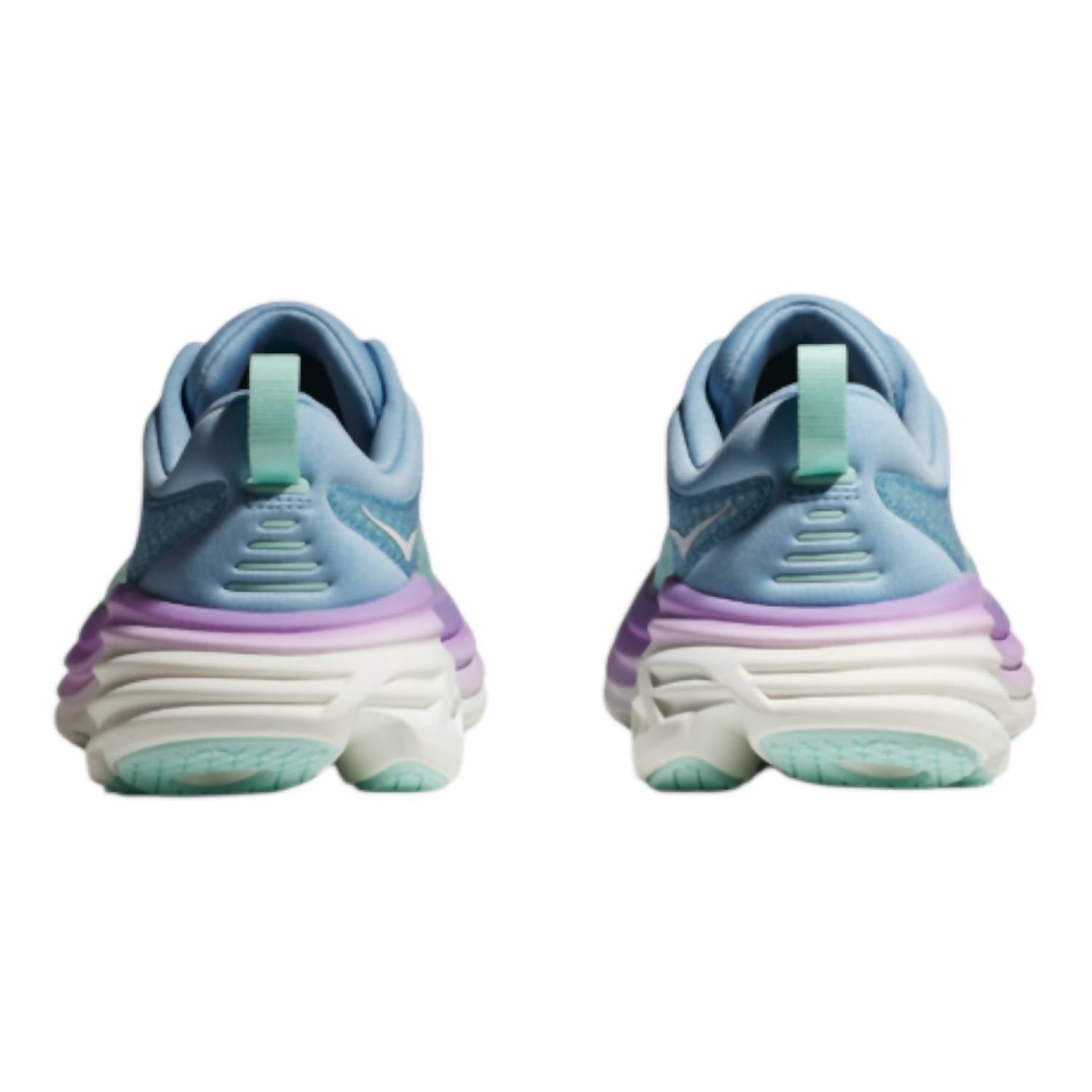 When fashion meets function. Introducing the Women's Bondi 8 Shoes by Hoka, designed for comfort and performance in athletic pursuits. These medium-width athletic shoes feature a rubber composition and come in a stylish Outer Space/Bellwether Blue color. The design includes a low heel height categorized between 1 1/4" to 2", ensuring a comfortable stride for adult women. With a round toe shape, these shoes are perfect for those seeking both style and functionality.