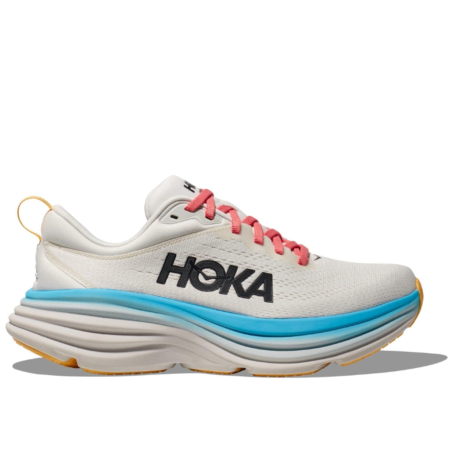 When fashion meets function. Introducing the Women's Bondi 8 Shoes by Hoka, designed for comfort and performance in athletic pursuits. These medium-width athletic shoes feature a rubber composition and come in a stylish Outer Space/Bellwether Blue color. The design includes a low heel height categorized between 1 1/4" to 2", ensuring a comfortable stride for adult women. With a round toe shape, these shoes are perfect for those seeking both style and functionality.