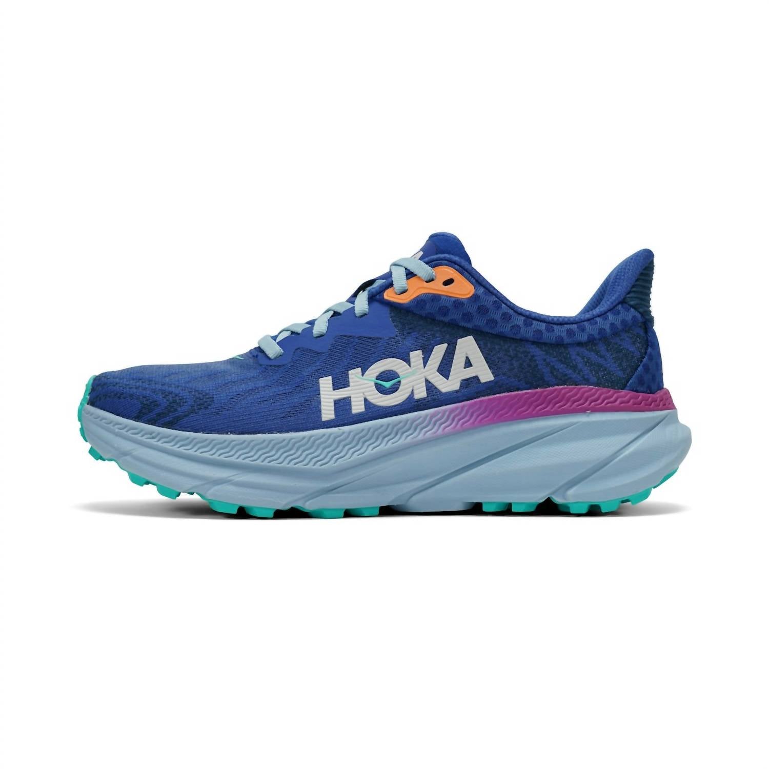 Workout in style with these adorable athletic sneakers. Explore new paths with the Hoka Women's Challenger ATR 7 Running Shoes, specifically designed for trail adventures. Featuring an Engineered Mesh upper, these shoes provide strategic midfoot support and high breathability, with a CMEVA midsole offering exceptional cushioning and protection. The durabrasion rubber outsole with a distinct stud profile ensures outstanding grip on various surfaces, enhanced by abrasion-resistant zones for durability. Designed with a forefoot height of 26 mm, a heel height of 31 mm, and a weight of 218 grams, these shoes promise comfort and stability in their Evening Sky/Drizzle hue.