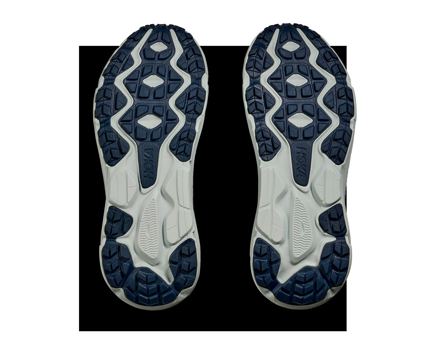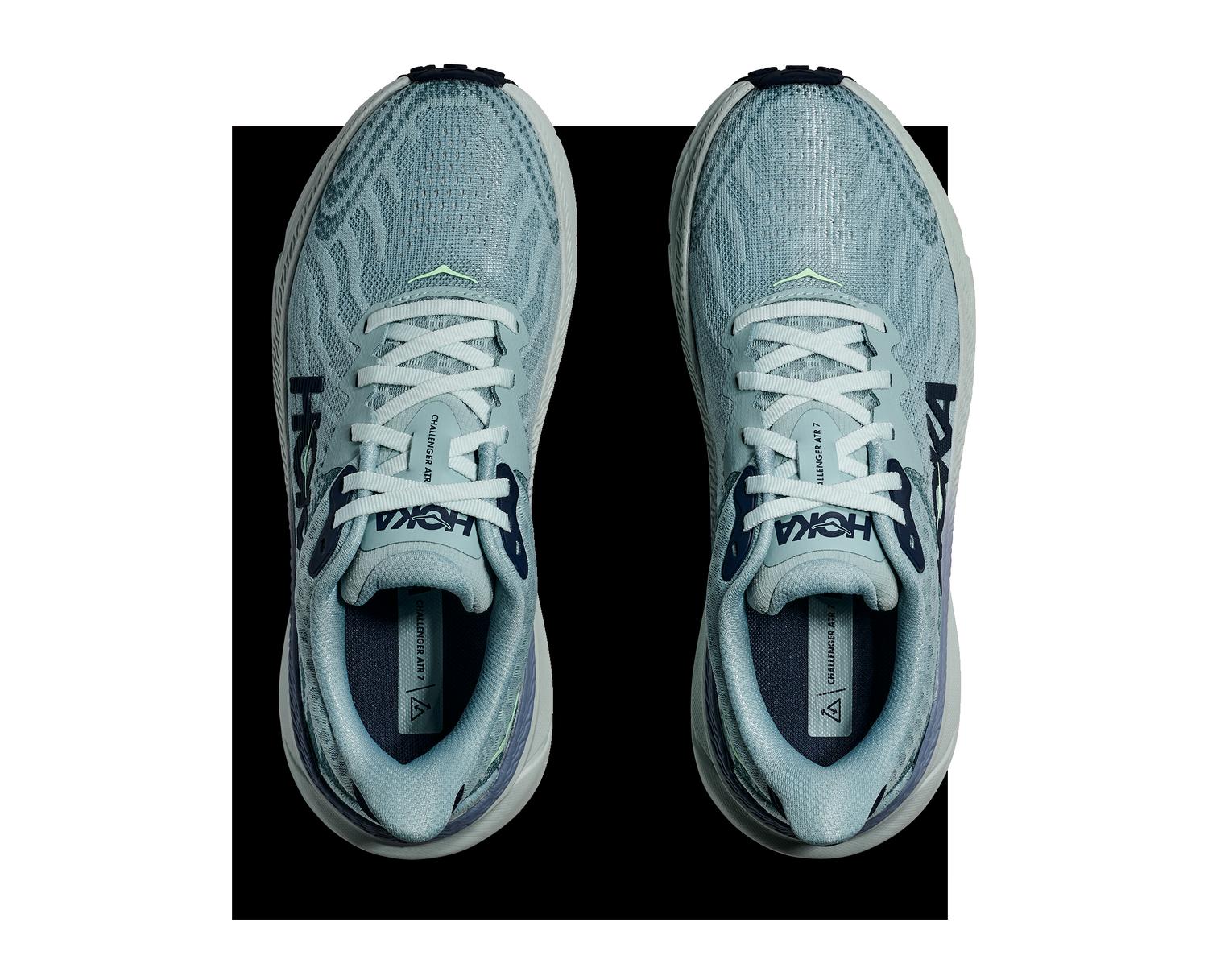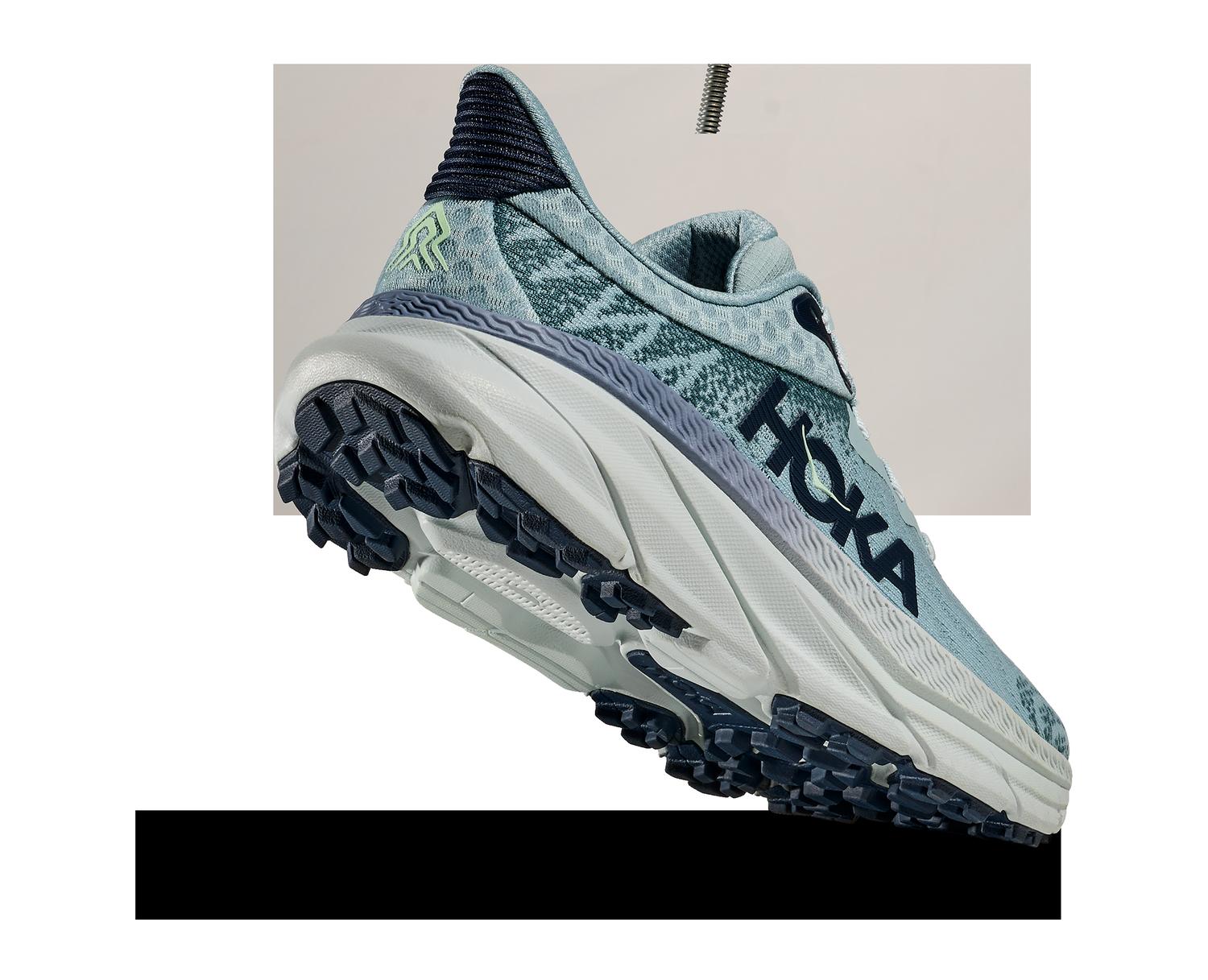 Stylish, comfortable and supportive. These athletic sneakers check all of the boxes. Meet the Women's Challenger V7 Medium by Hoka, the perfect fusion of street style and trail performance. This blue athletic shoe features a simplified mesh upper and a round toe design, crafted with enhanced stack height and a soft new foam for utmost comfort. It boasts proprietary rubber and a redesigned outsole inspired by gravel tires, improving traction with tightly spaced central lugs and larger perimeter lugs for varied terrains. Shoe width: Medium. Ideal for women who value both fashion and functionality on their runs.