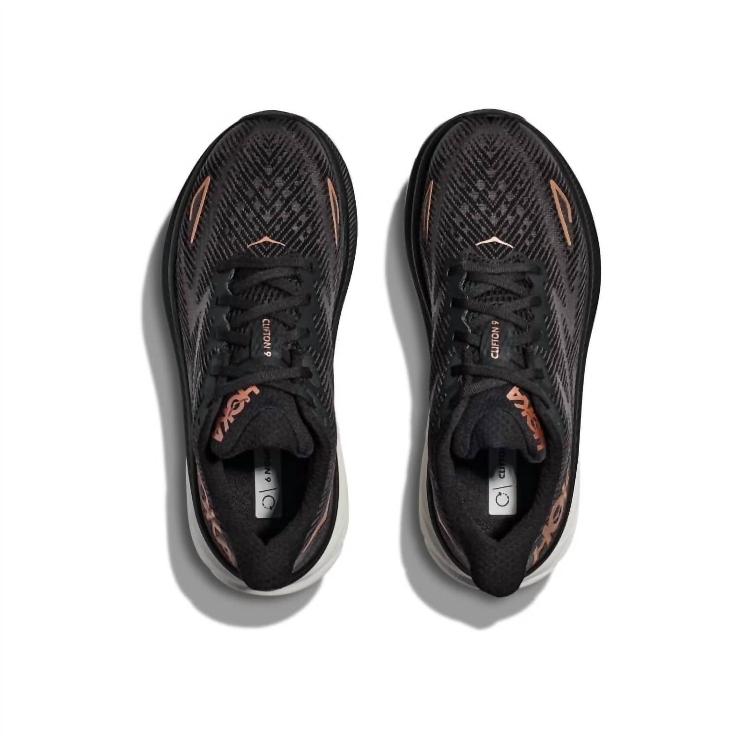 Cute, functional, and comfortable. These sneakers check all the boxes. Introducing the Women's Clifton 9 Running Shoes by Hoka, crafted for the perfect blend of function and style in bold black/copper. These sneakers feature a round toe design and engineered mesh upper for exceptional breathability, keeping feet cool during intense workouts. Enjoy the soft, responsive cushioning of HOKA's signature midsole and experience featherlight construction that enhances agility. Ideal for the athleisure trend, these shoes cater to fitness enthusiasts seeking stability and a sleek design for their spring workouts.