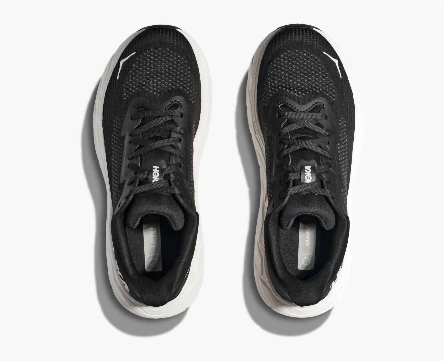 Stylish, comfortable and supportive. These athletic sneakers check all of the boxes. Experience the perfect blend of style and support with the Women's Hoka Arahi V7 in sleek black and white. Designed for everyday running and walking, these athletic shoes feature a supportive flat-knit upper with J-Frame™ midsole support and a dual gusset to ensure a secure fit. The plush tongue and compression molded EVA midsole offer comfort, while the zonal rubber and durabrasion rubber enhance durability. With a round toe shape and flat heel, these shoes are ideal for athleisure and fitness occasions.