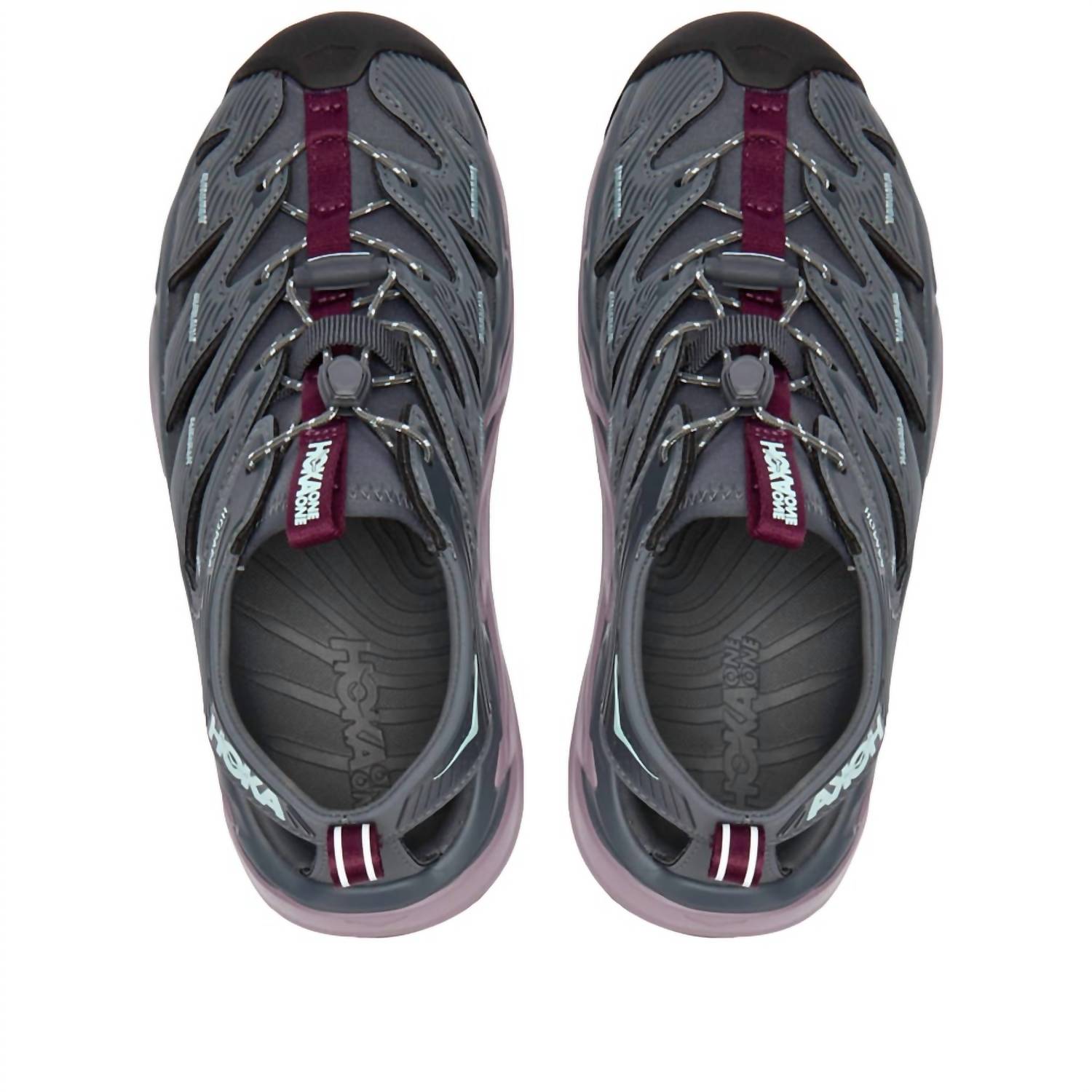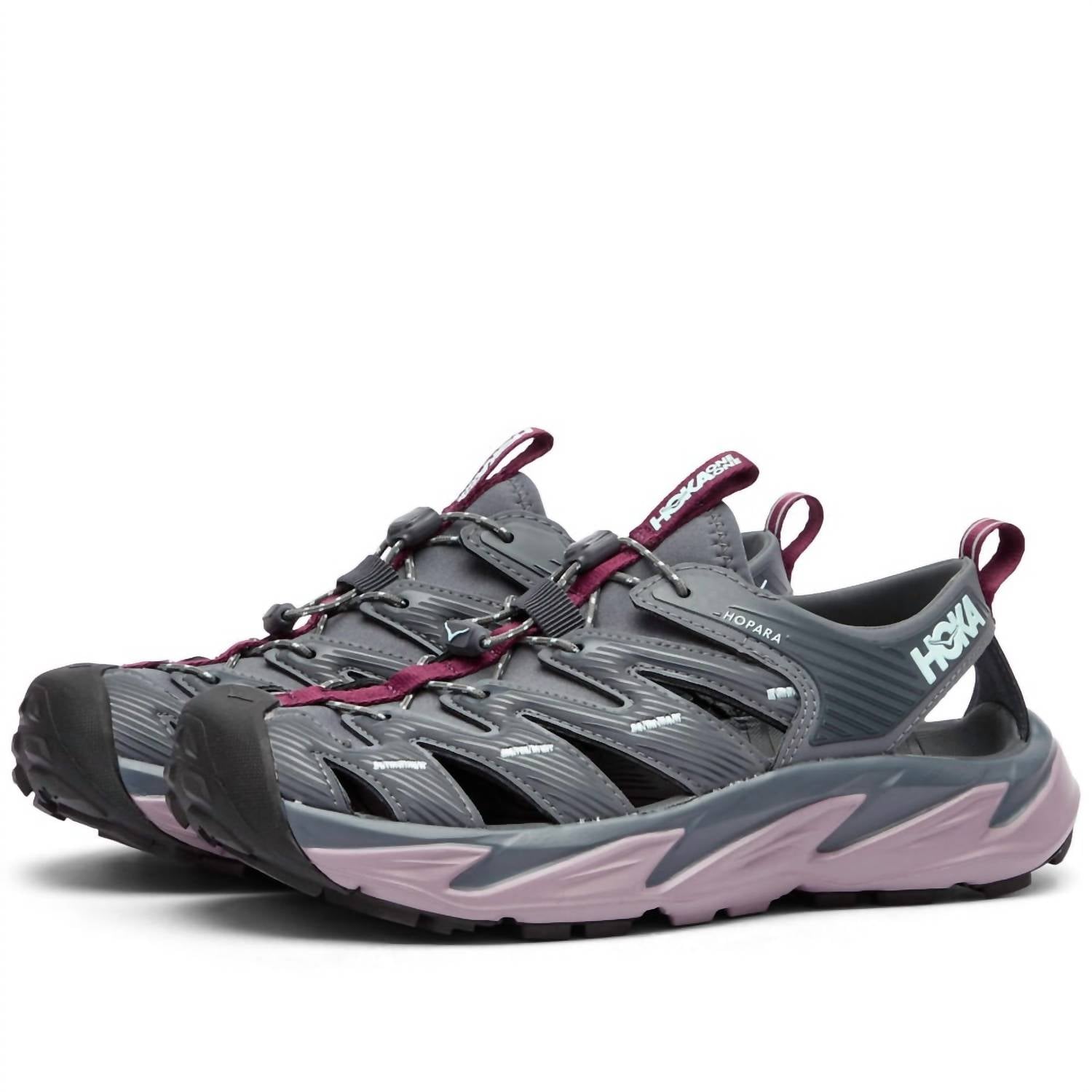 Get ready for your next hiking adventure with the Women's Hopara Outdoor Shoes by Hoka, featuring a Castlerock/Elderberry color scheme. The synthetic and neoprene upper provides flexibility, comfort, and breathability, while the gusseted neoprene construction ensures a secure fit and reduces friction when wet. Enjoy easy adjustability with the quick-lace system and enhanced grip on various surfaces thanks to the 4mm multidirectional lugs and sticky rubber outsole. These shoes also include a rubberized EVA midsole for cushioning and a rubberized toe cap for debris protection. Flat heel design with a round toe, designed for adult women.