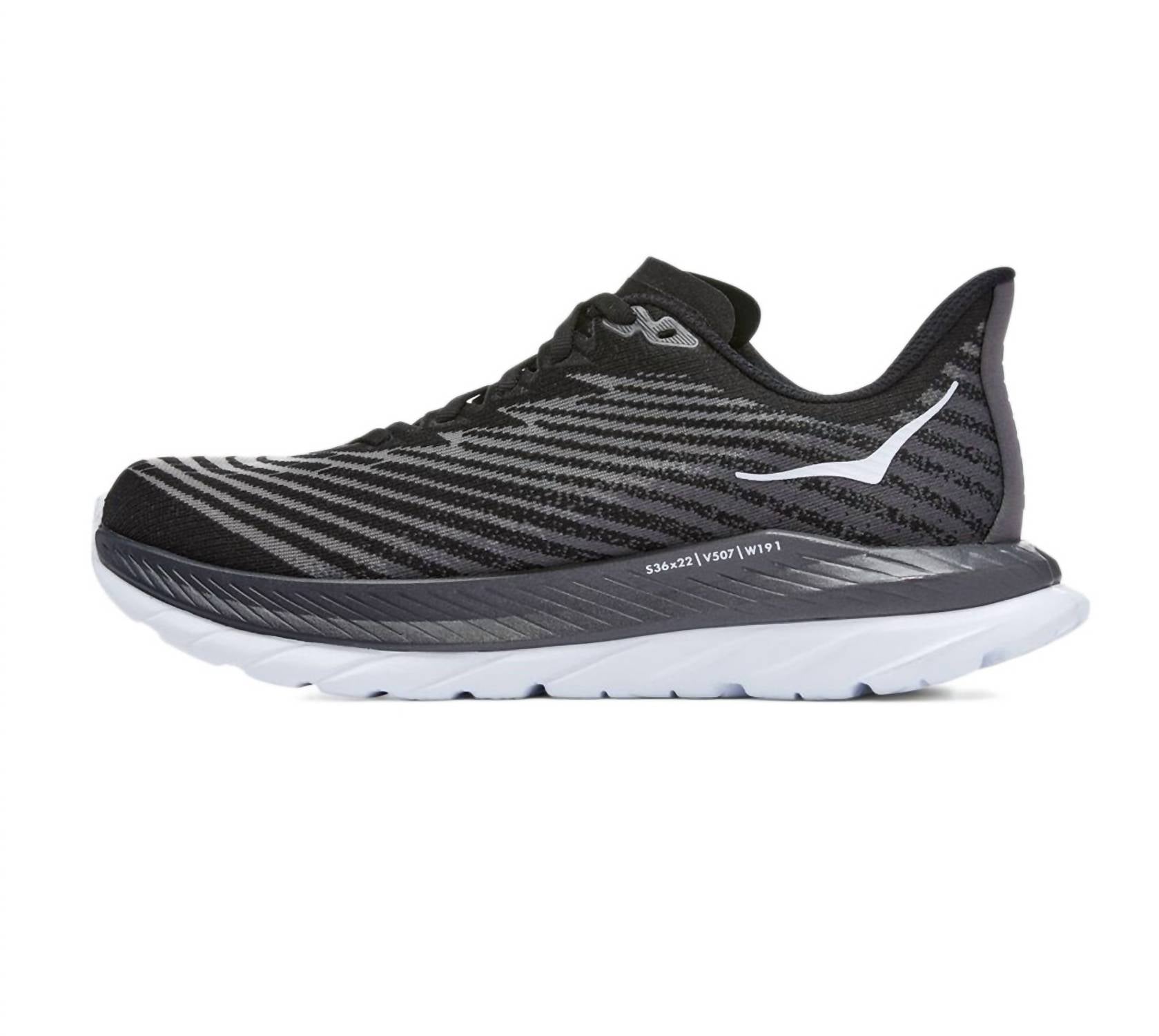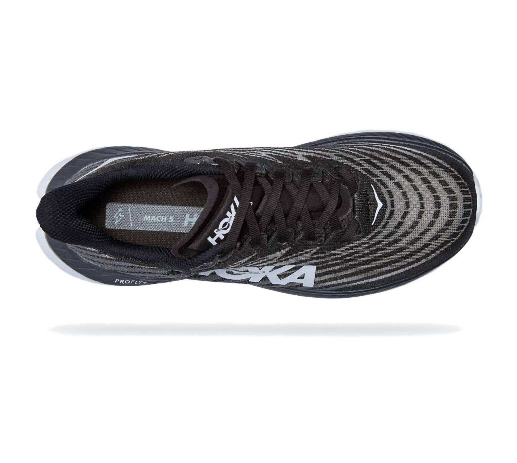 Workout in style with these adorable athletic sneakers. Elevate your running experience with Hoka's Women's Mach 5 Running Shoes in Black/Castlerock, crafted for high performance. These shoes feature a creel jacquard engineered mesh upper, lightweight responsive foam, and ProFly™+ construction for a snappier ride. The shoes boast a molded EVA sockliner and a rubberized EVA outsole, making them an ideal choice for fitness and workout sessions. Designed with an articulated heel collar and a lay-flat gusseted tongue, these shoes prioritize comfort and style while integrating sustainability with recycled materials. Shoe Width: Medium. Toe Shape: Round Toe. Origin: Vegan.
