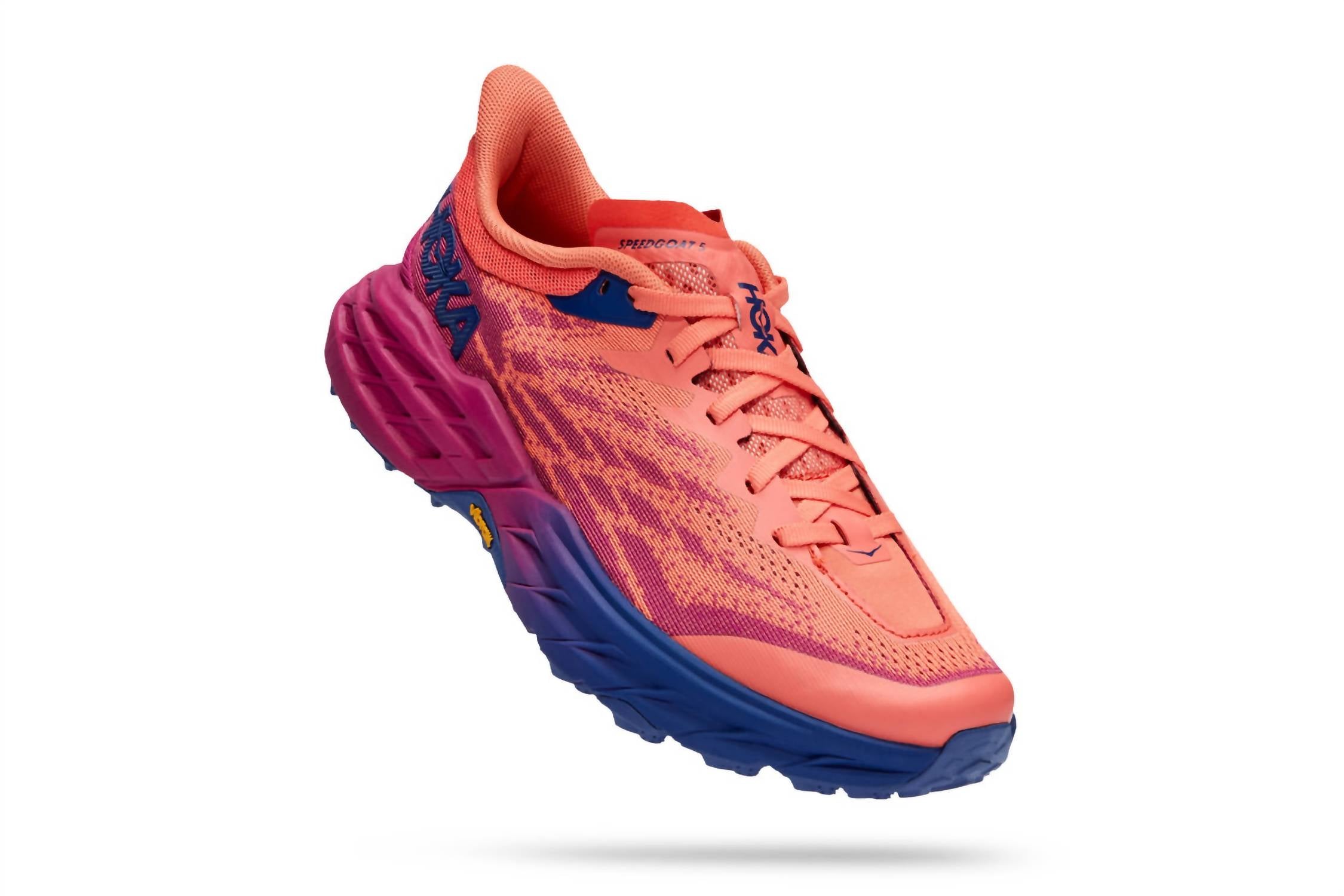Stylish, comfortable and supportive. These athletic sneakers check all of the boxes. Enhance your trail performance with the Women's Speedgoat 5 Trail Running Shoe by Hoka, a perfect blend of support and style. Engineered with a lightweight 241g profile, it’s designed for offroad walking and running, catering to those seeking extra cushioning. The standout features include a Vibram® Megagrip outsole with multi-directional grip for confidence on varied terrains like grass and rugged surfaces, accompanied by a refined collar shape to reduce pressure on the Achilles. Its orthotic-friendly rocker sole, combined with a 4.0mm sole elevation and Festival Fuchsia/Camellia colorway, ensures both functionality and fashion for your trail endeavors.