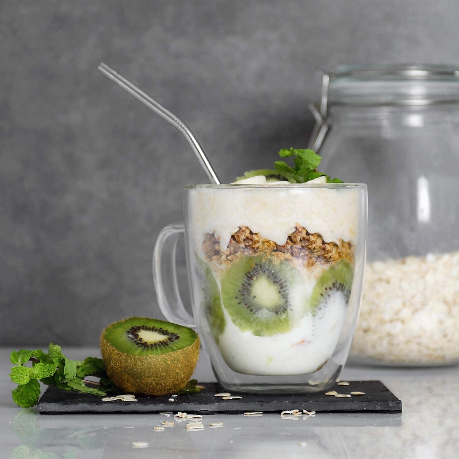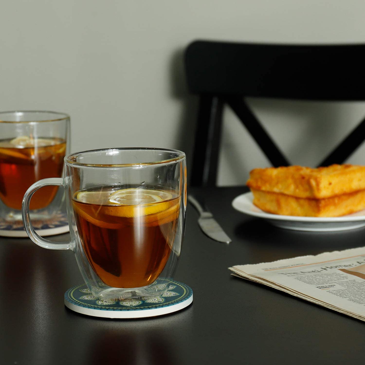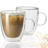 Double walled design: The double layer glass mug set keep hotter and colder than the normal single walled glass and ceramic mugs. Cool to touch, without burning fingers | Design: There is a small round hole design on the bottom of glass coffee cup to prevent glass mugs to burst when using. It allows the glass to breathe in process. It is sealed, the water would not go in. | Suitable for daily use: The 12 oz cup glasses are perfect for serving hot coffee, hot tea, lattes, cappuccinos, every beverage. Even ice cream, smoothies and more! Plus, they are microwave and dishwasher safe, but we recommend washing by hand. | Lightweight: Somebody said it may be made from plastic, but not! It is true glass! The glass cup is made of mouth-blown high borosilicate glass, it is lighter than the normal glass, but durable and stable. | Keeps your coffee hot for longer: glass coffee mugs for hot beverages that keep your latte, cappuccino, or coffee hot while your hand stays cool.