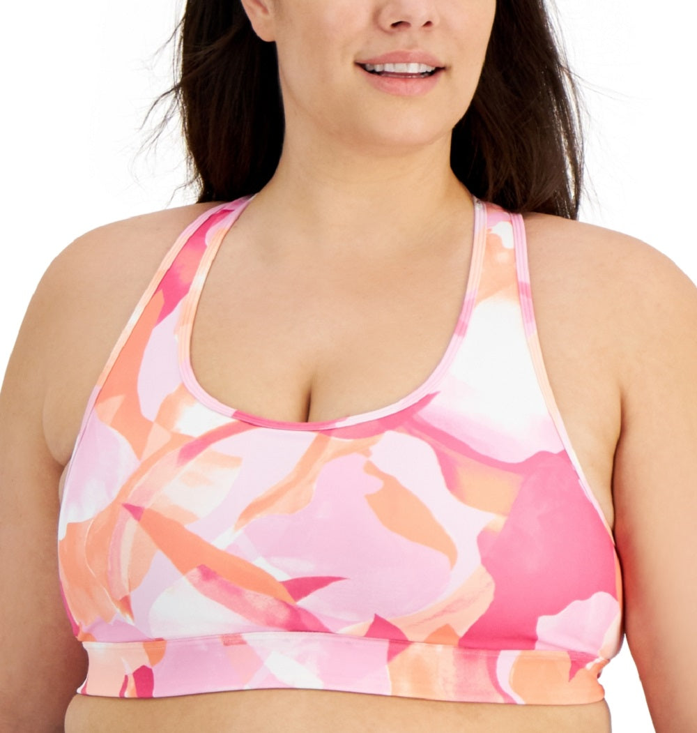 A pretty floral print livens up this plus size sports bra from ID Ideology| a designed for medium-impact activities and finished with a strappy back|