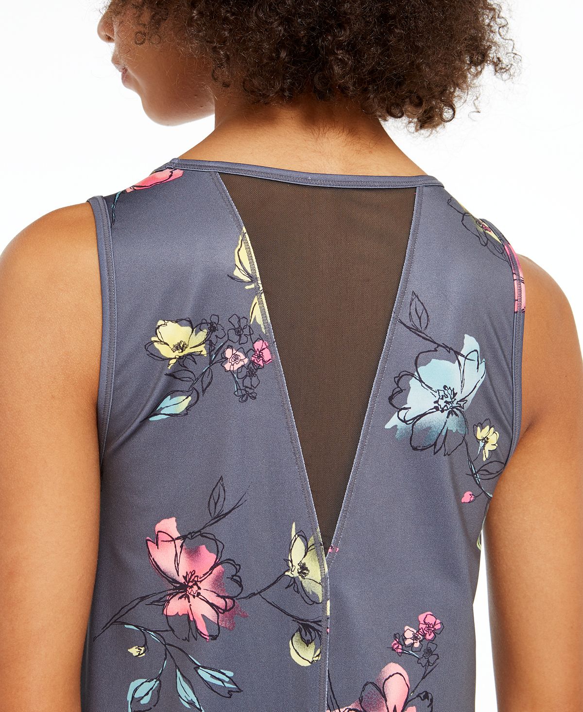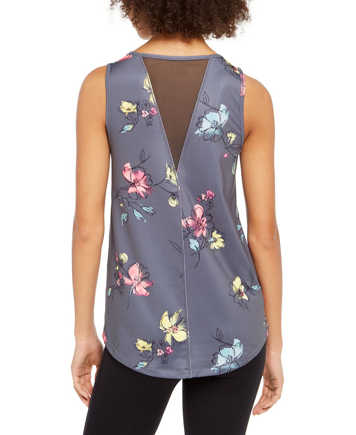 A vintage-inspired floral print brings a lovely look to this Ideology tank top. Airy mesh at the back adds breathable comfort.| Fitted; approx. 26-1/2 long; mesh inset at back| Crewneck| | Body| mesh; polyester/spandex