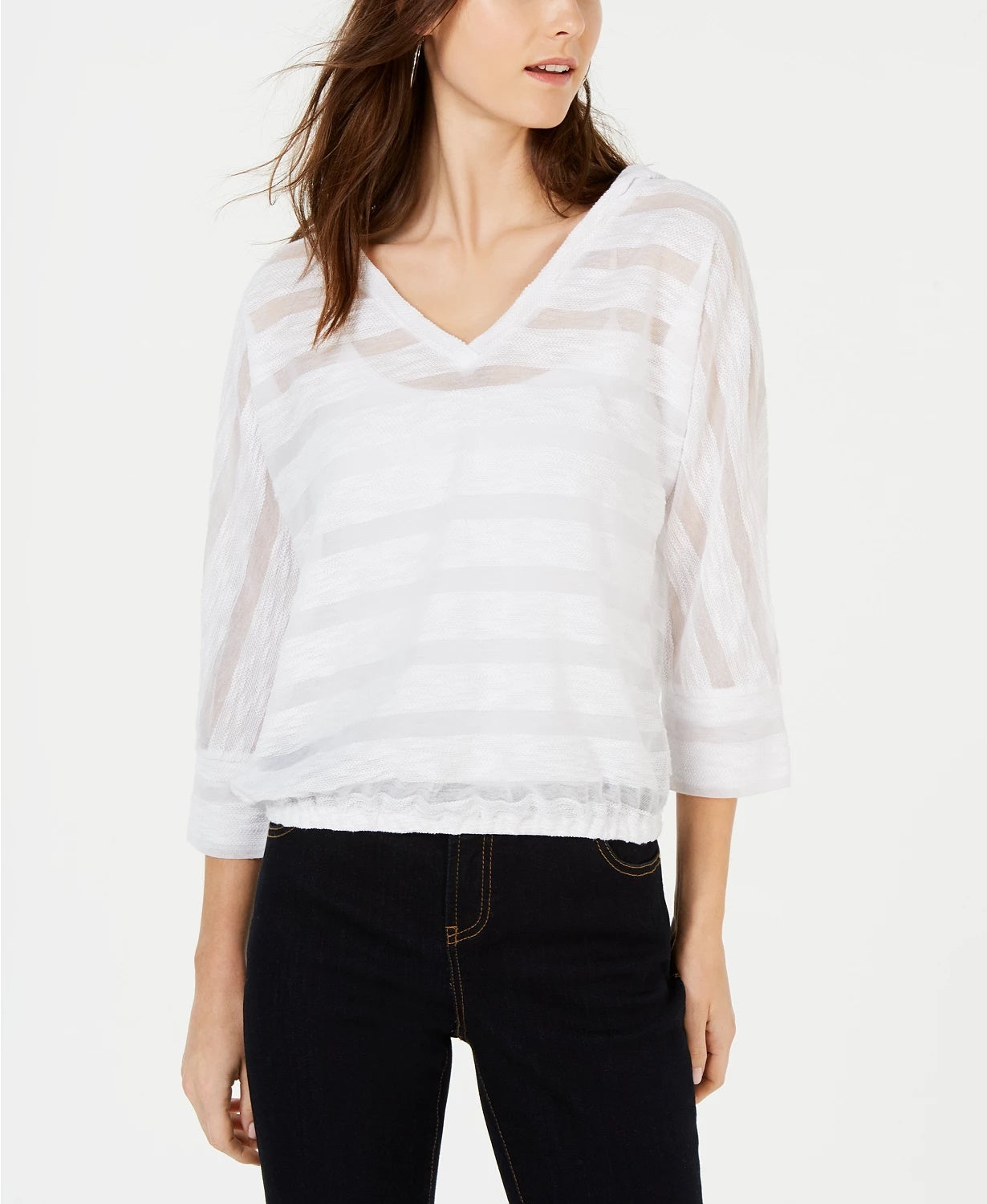 Hits at hip|V-neck with attached hoodie|Striped illusion details|3/4-sleeves|Sheer; wear with layers