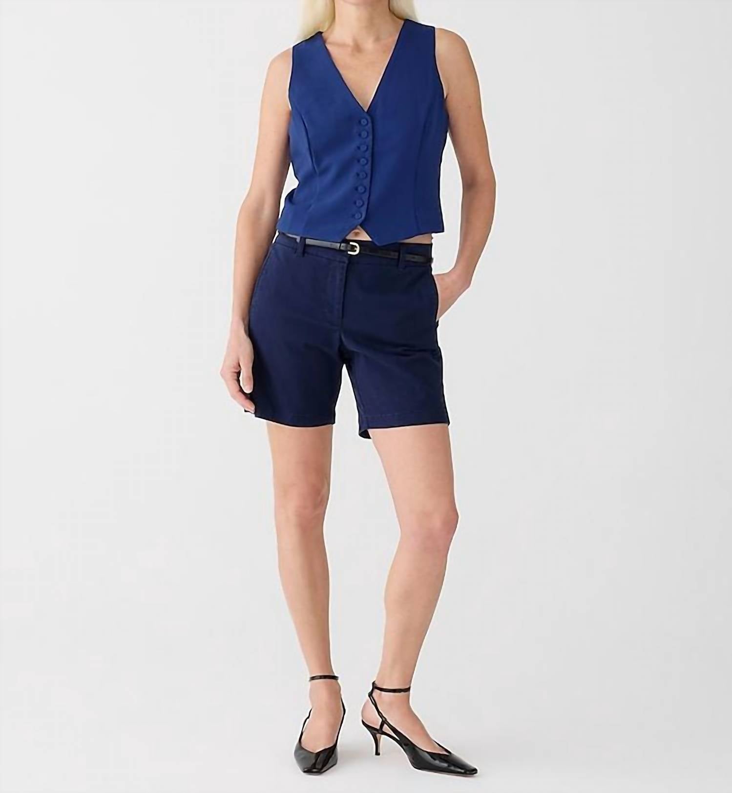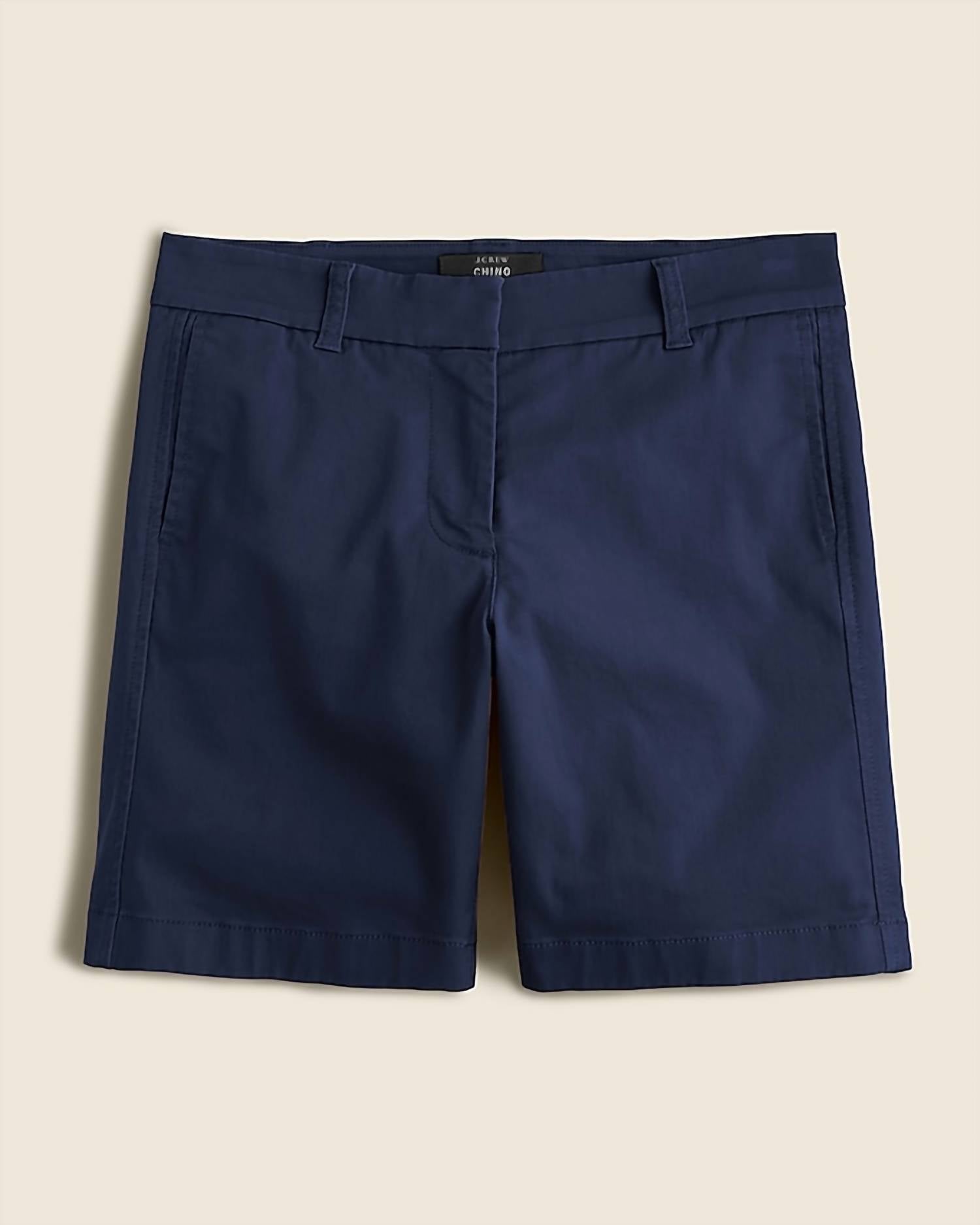 Fit to perfection, we love these high-waist shorts and you will too. Elevate your warm-weather wardrobe with the J.Crew 7 Inch Stretch Chino Short in a classic navy hue. Designed for women and offering a high waist fit, these shorts are crafted from a comfortable cotton blend featuring 97% cotton and 3% elastane, ensuring ease of movement. The shorts boast a tailored silhouette with a solid pattern and are equipped with a practical zip closure. Care is a breeze with machine wash and tumble dry instructions, making them a reliable and stylish choice for any occasion.