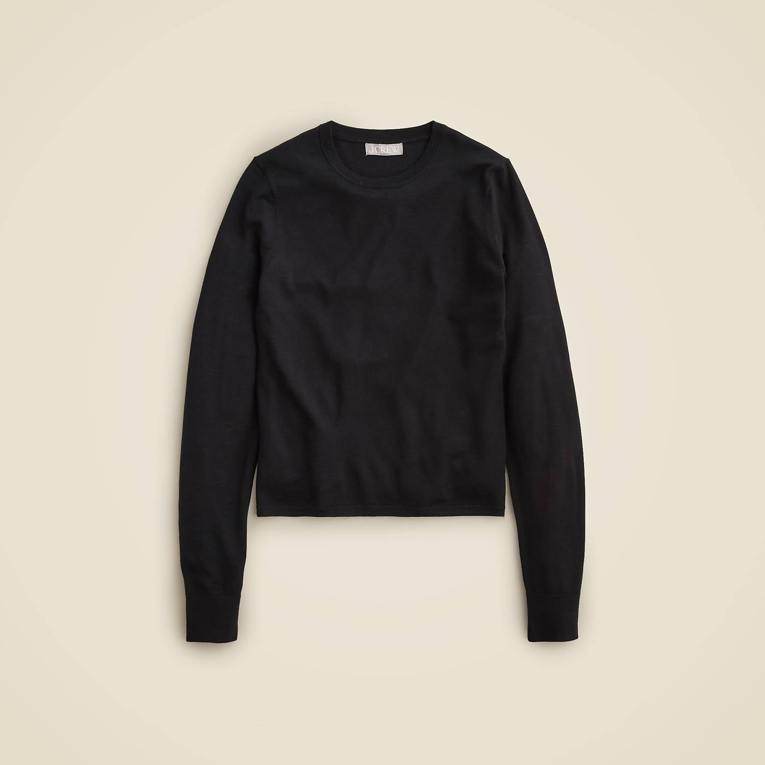 Experience the perfect blend of comfort and style with this trendy crew neck sweater, designed to effortlessly elevate your wardrobe. Pair it with your favorite denim and loafers for the perfect look. Discover the Carolyn Fitted Crewneck Sweater in Merino Wool by J.Crew, a luxurious staple for your wardrobe. This long sleeve sweater is crafted from 100% merino wool, with cuffs composed of 81% merino wool, 17% polyamide, and 2% elastane for added stretch. With a garment length of 21.5 inches, this piece is designed to sit at the hip for a flattering fit. Originating from Cambodia, this solid black crewneck features a convenient pull-on closure and is machine washable with tumble dry instructions for easy care.