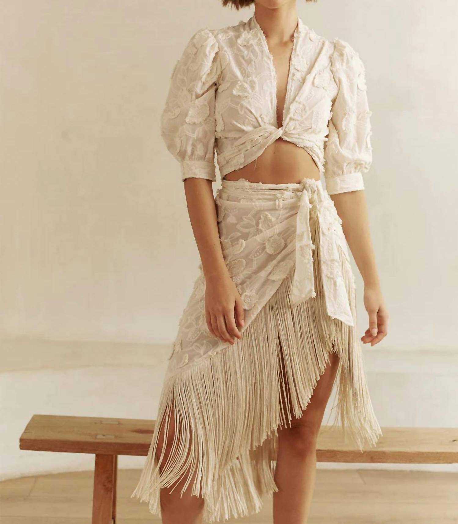 Introducing the Vera Midi Skirt by JBQ, a sophisticated and luxurious choice for any occasion in elegant Vanilla. Crafted from 100% Cotton, this intricately embroidered and delicately frayed skirt features a three-dimensional look with a striking asymmetric hem and silk fringe detail. This wrap-around waist design is perfect for elevating any vacation outfit with its nod to 90s fashion trends. Please note, this style runs small. Model is 5'9" and is wearing a size small.