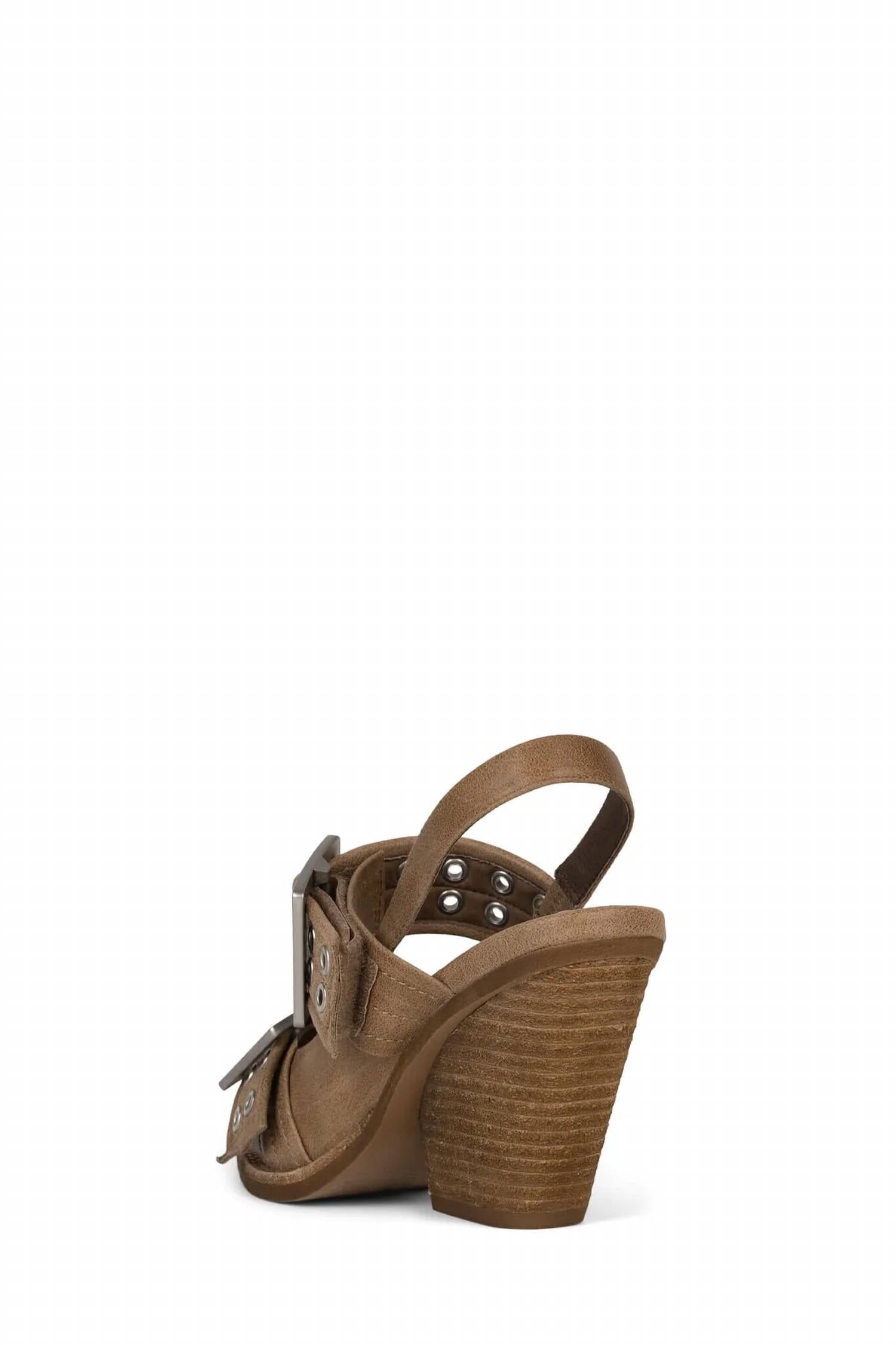 Step up your style in chic boot/heel hybrid in a versatile tan hue. Feature a pointed toe and a western-inspired design with a slingback upper and double buckle straps. Perfectly complimented by a tan stacked block heel. Crafted with a synthetic upper and leather/synthetic lining. Boast a comfortable 3.5" heel and a 0.25" platform for added height. Velcro closure ensures a snug fit. Fit true to size.