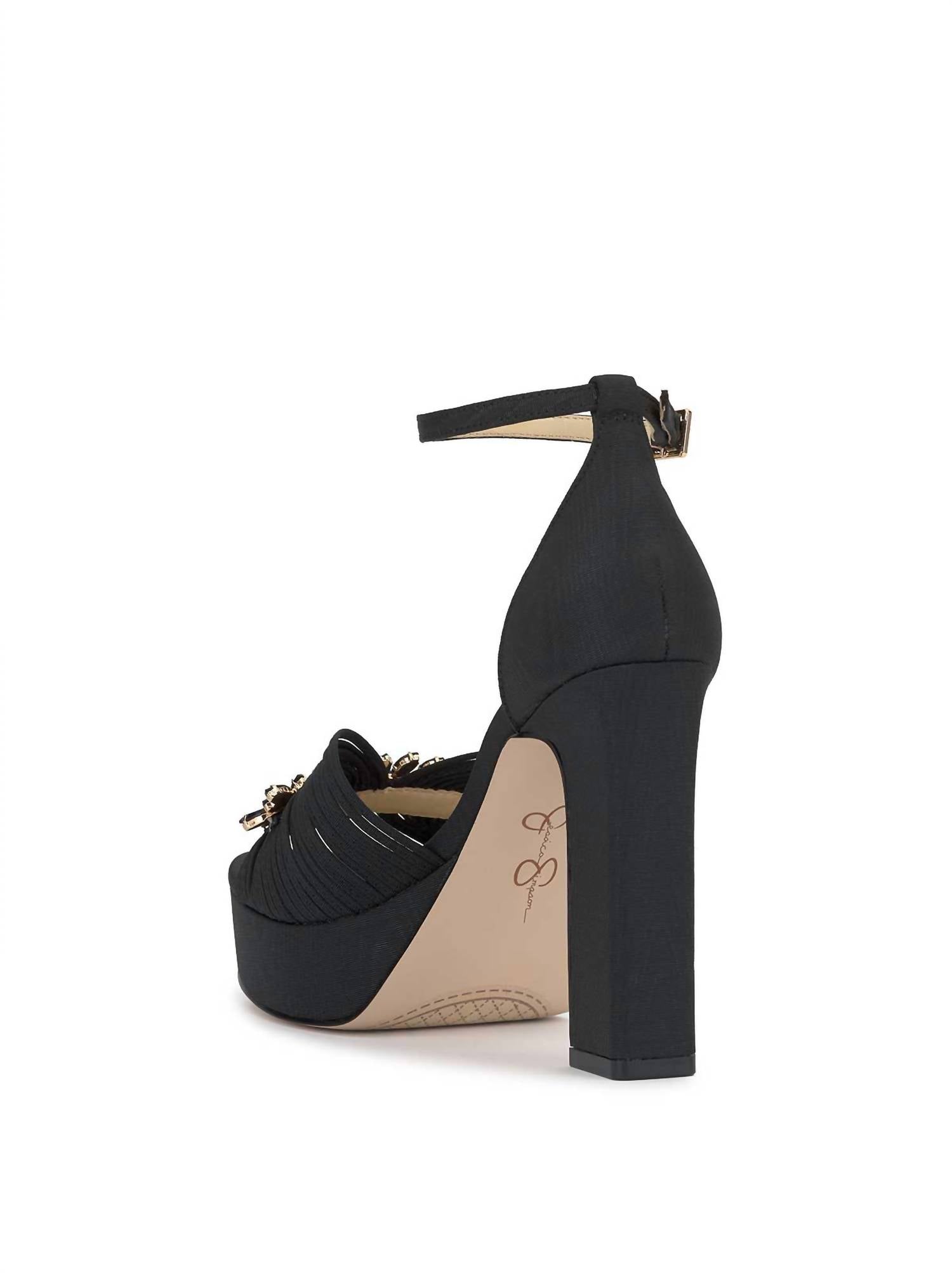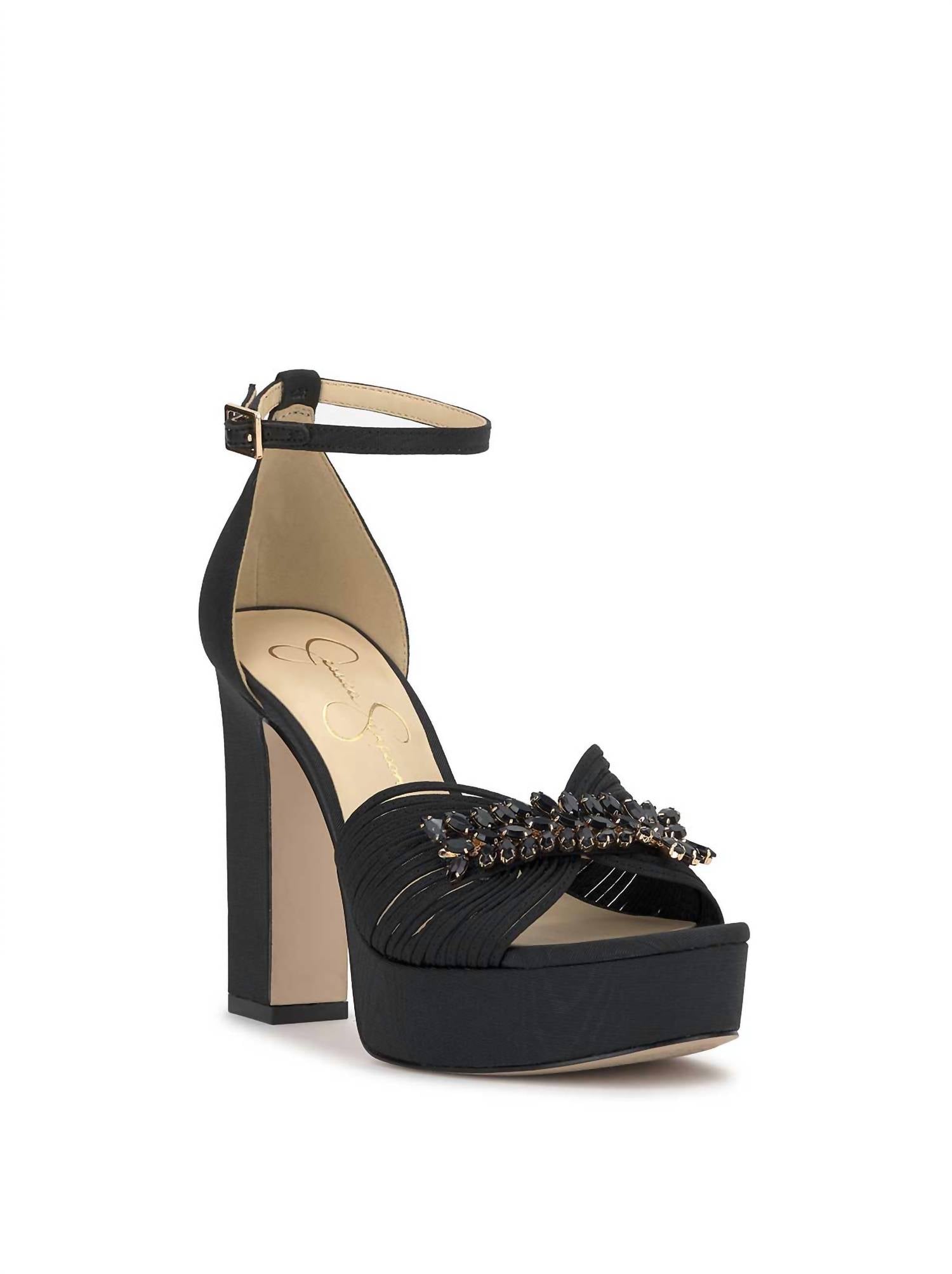 Step into elegance with the Anissia Platform by Jessica Simpson, a high-heeled delight in Black satin. These women's platforms boast a sophisticated rhinestone embellished detailing and an open toe design. Featuring an approximate 4.5" platform heel height and a 1.2" platform height, they provide both style and a little lift. The ankle strap secures with a buckle closure, and the shoe is lined with synthetic materials complemented by a sturdy rubber outsole.