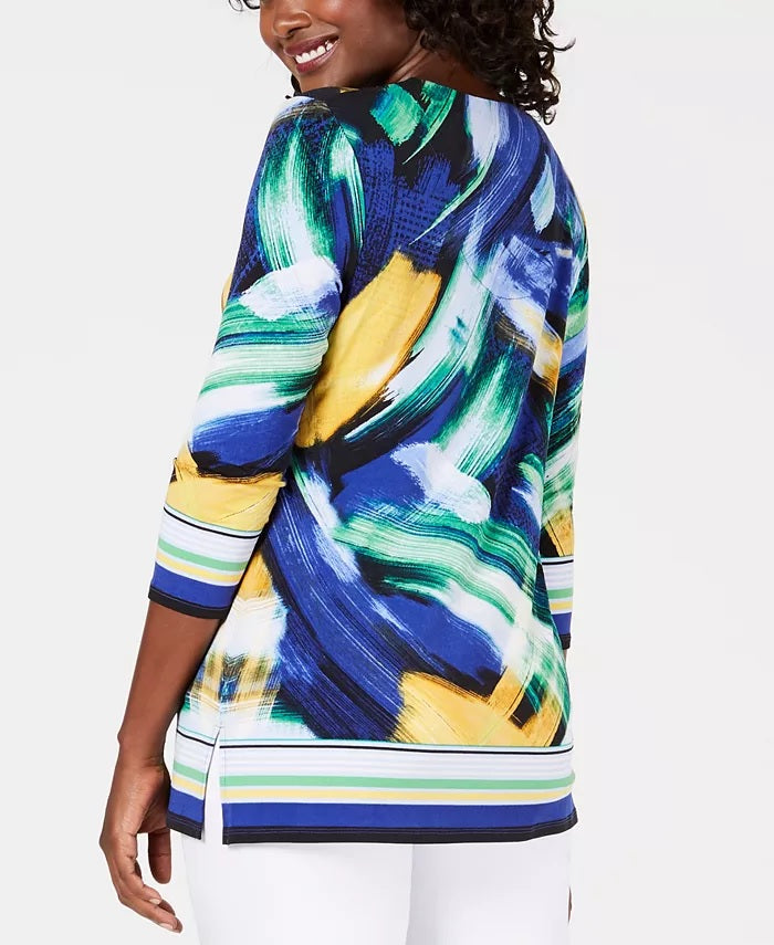 Relaxed fit; hits at hip; approx. 25-1/2 long|Designed to fit and flatter 5'4 and under frame|Y-neckline with stud embellishments and contrast trim|Hemline border with side-seam slits|3/4-sleeves with contrast trim