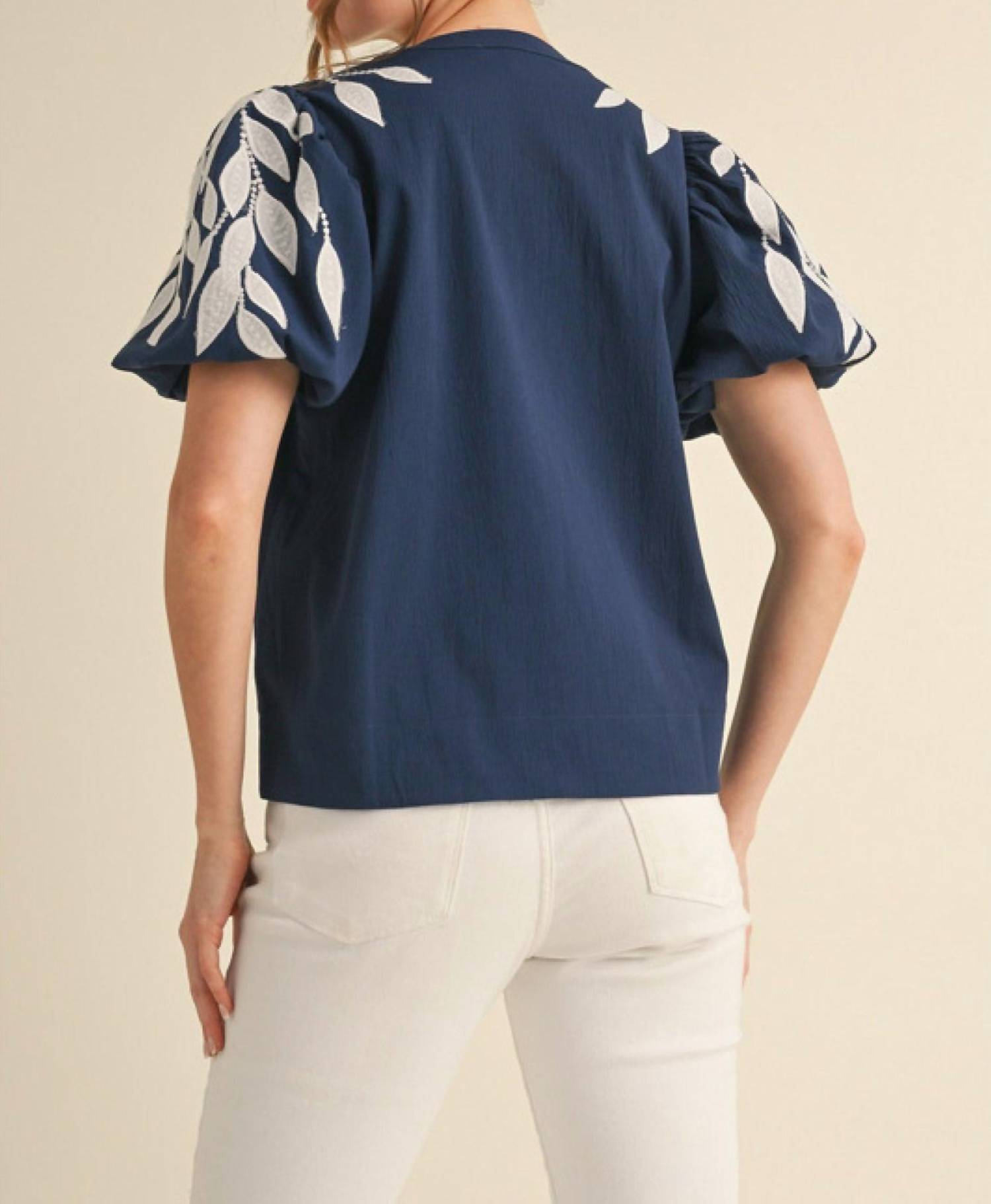 Introducing the Gwen Embroidered Puff Sleeve Top by Jodifl, a chic winter essential designed in a navy, white, and light grey color palette. This blouse features a flattering open V-neck and stylish puffed short sleeves adorned with leaf embroidery. Crafted from 100% Polyester with 100% Cotton embroidery, it offers a pull-on closure for easy wear. Measuring a garment length of 24 inches, it's best maintained through hand washing. Available bust sizes are Small: 38”, Medium: 40”, Large: 42”.