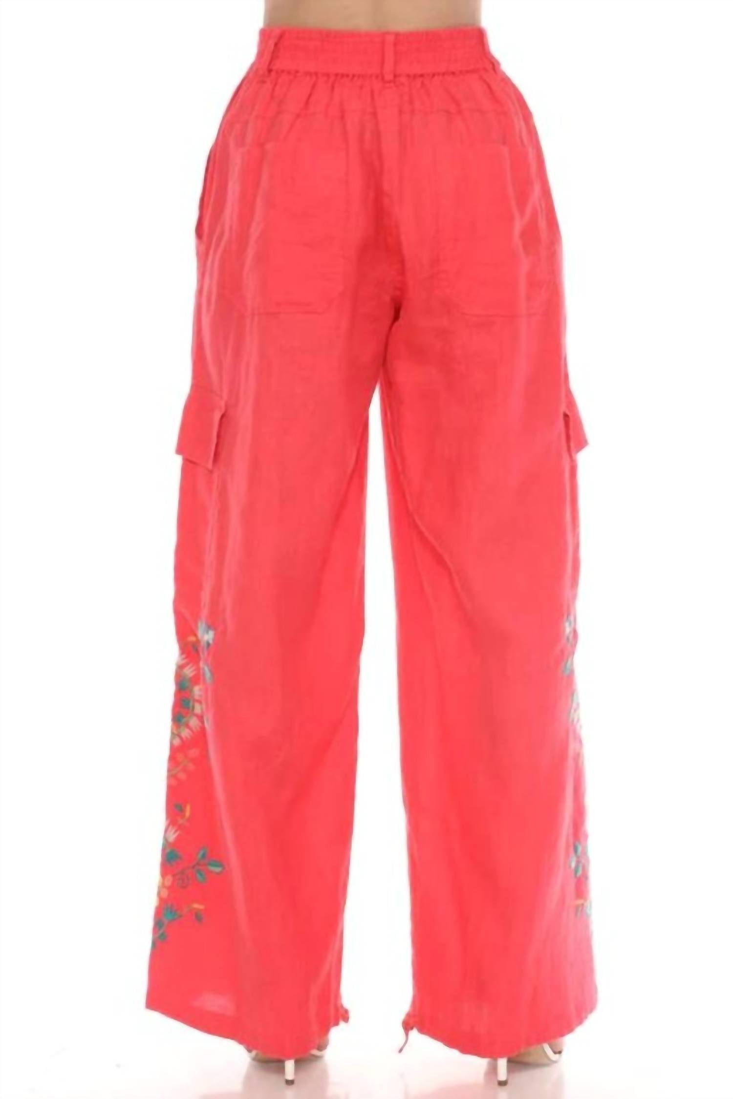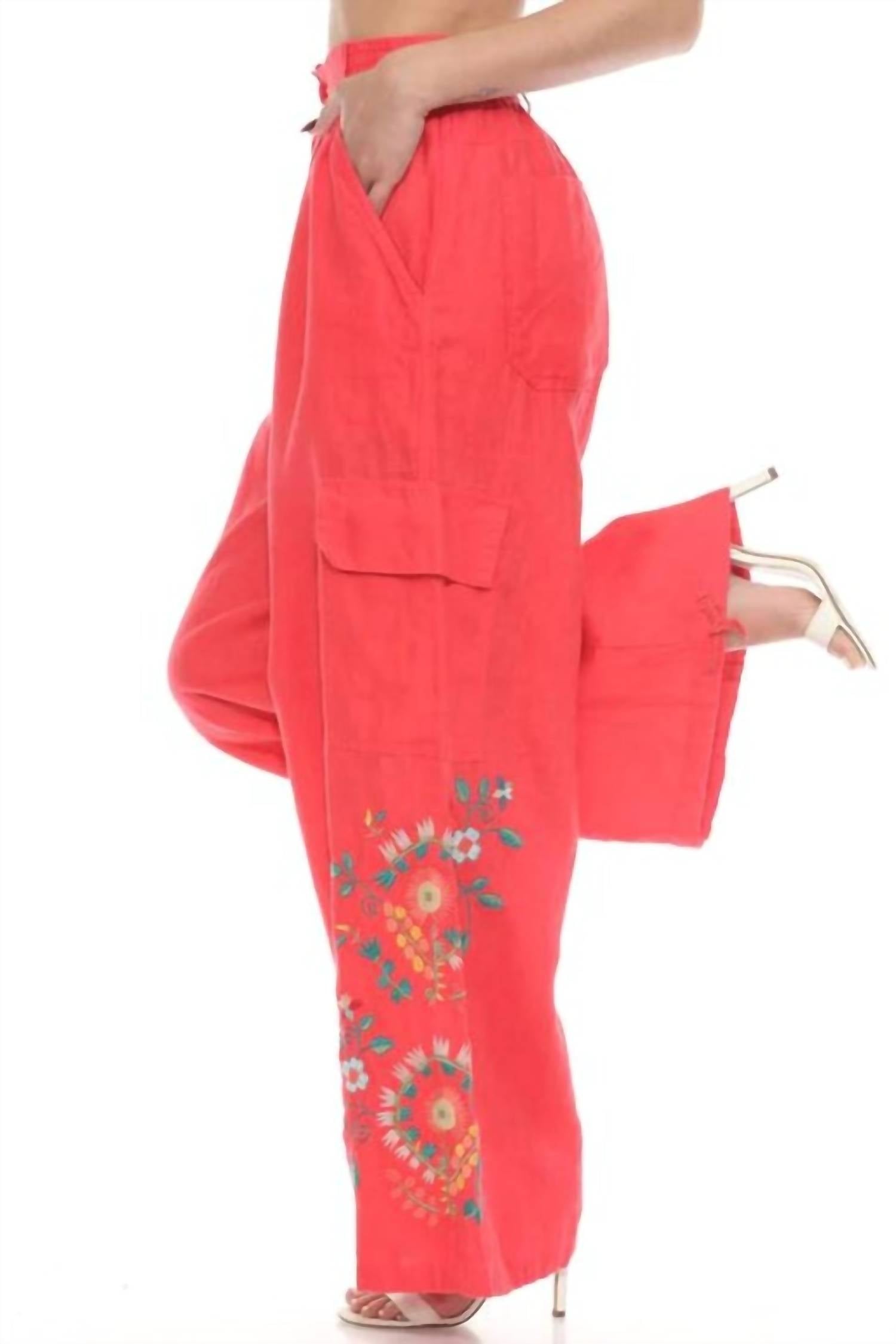 Elevate your casual wardrobe with the Drawstring Hem Cargo Pant—a stylish twist on a classic. These cargo pants are made from breathable linen and offer a relaxed fit with a wide leg silhouette perfect for warm-weather wear. Designed for comfort and function, it features a button and zipper closure paired with an elastic waist for an easy, flexible fit. With six pockets for everyday essentials and intricate floral embroidery on the side, this pant effortlessly blends artistic flair. The drawstring hem lets you customize the look—cinch it up for a tapered style or wear it loose for breezy movement. From weekend errands to laid-back outings, these cargos are your go-to for versatile, statement-ready style.