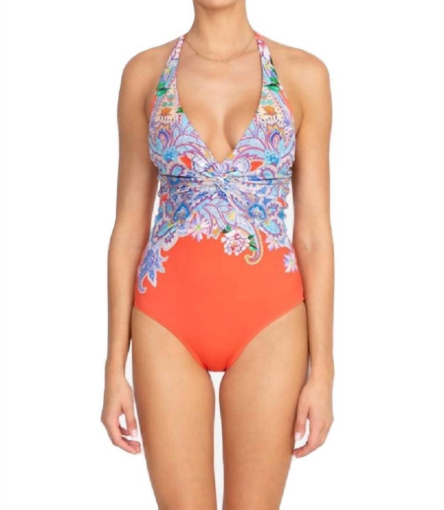 This one piece fits like a glove and covers all the right areas.83% Polyamid/17% elastane. Twist front one piece. Molded cups for added support. Sash tie at neck to adjust fit. Moderate back coverage. Fully lined. Model height: 5'10". Made from Xtra Life LYCRA. Chlorine, fade and pill resistant. UPF 50+ offers sun protection from harmful UV rays. Rinse in cool water after use. Dry thoroughly. Hand wash cold. Wash inside out, do not bleach, do not wring or twist. Line dry or flat dry, do not iron.
