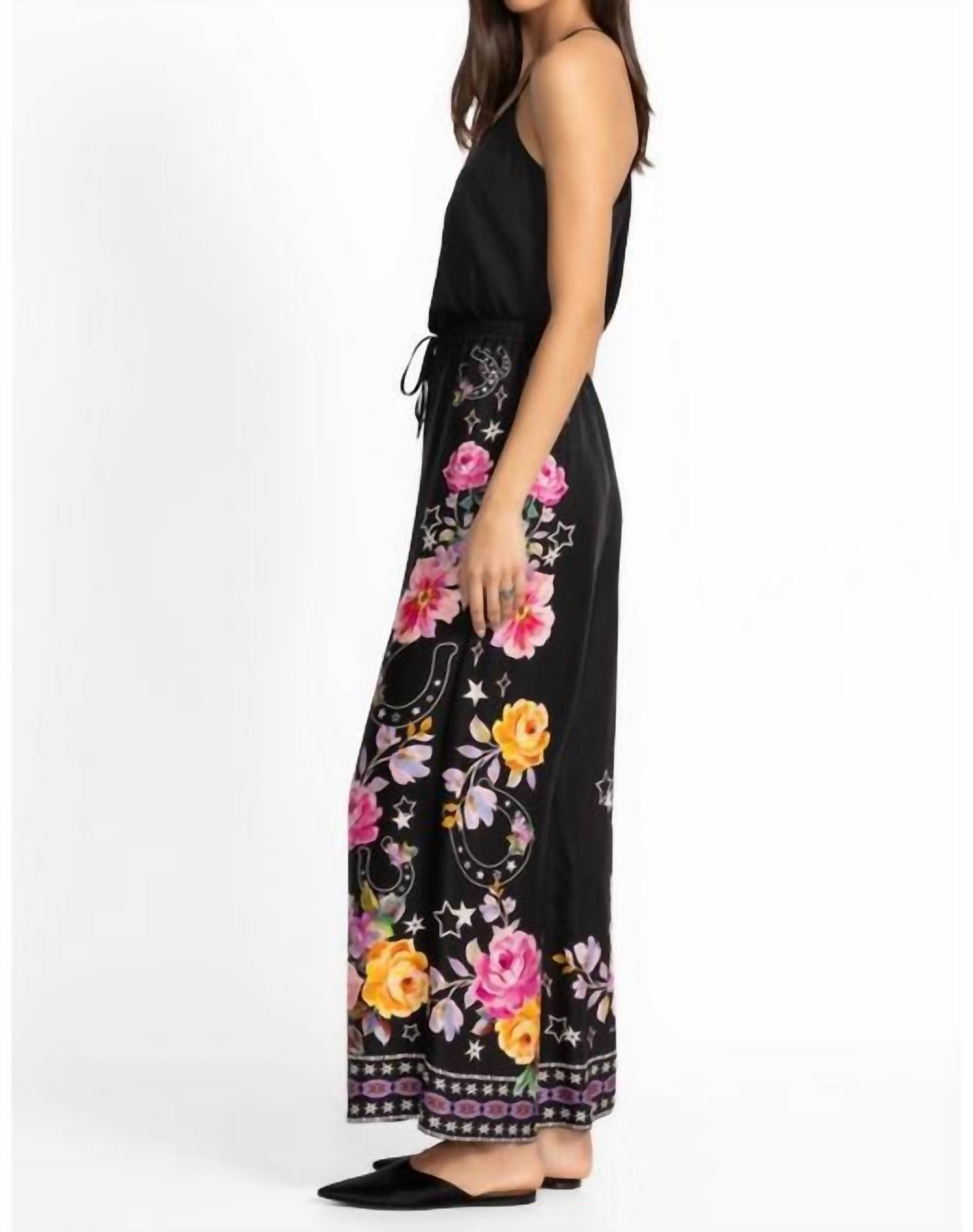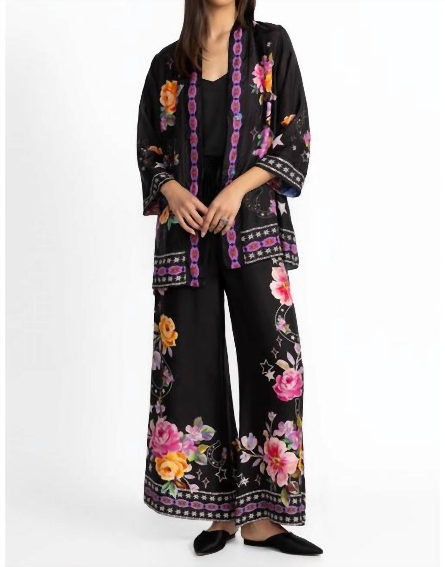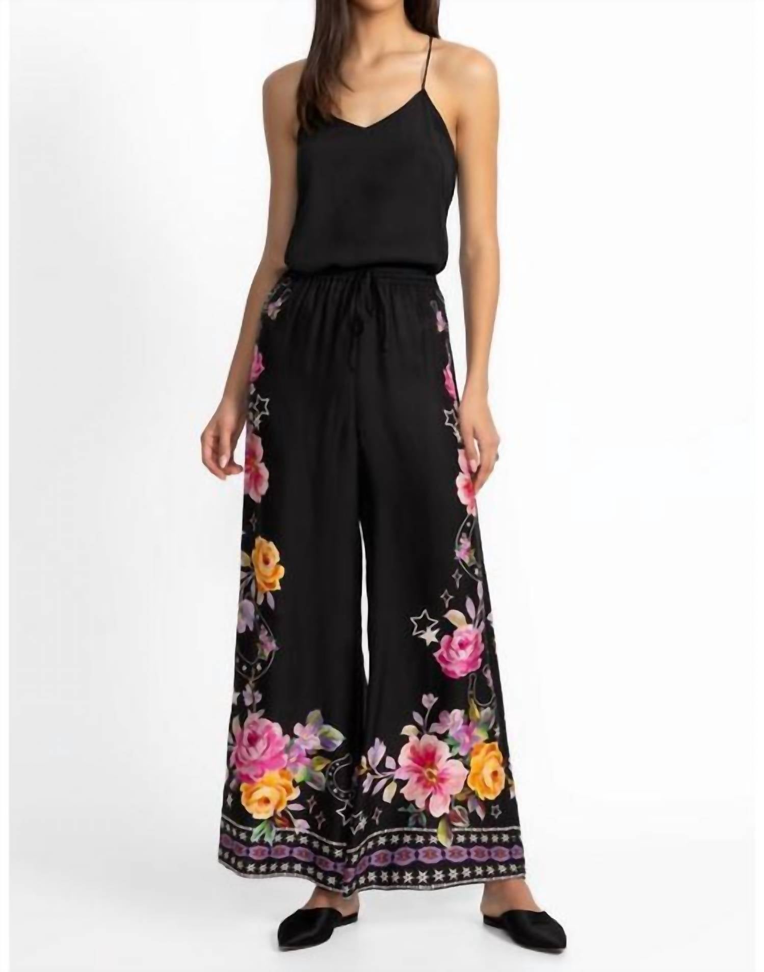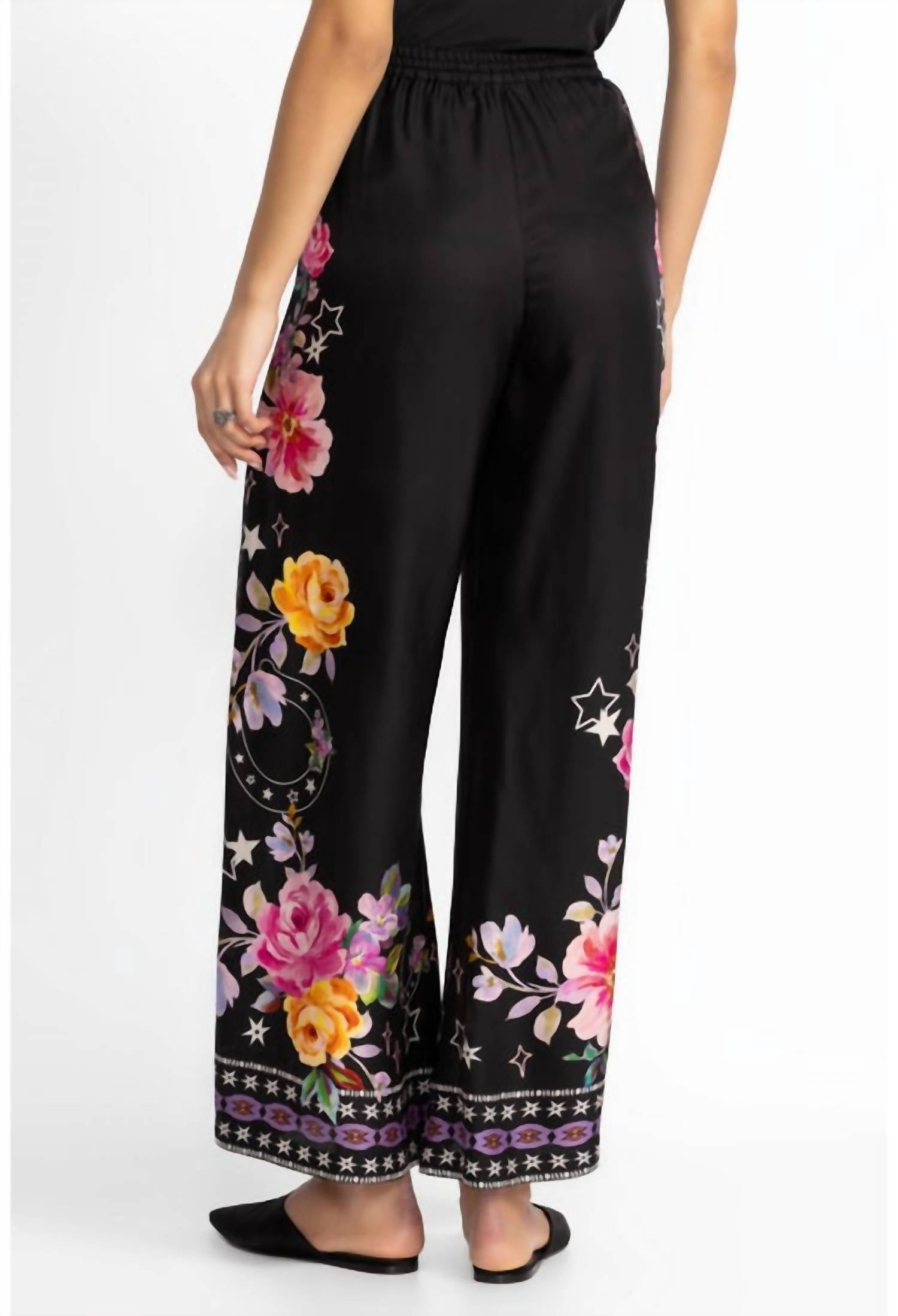 The Frankie Easy Pants feature a stunning floral design on a rich black background and are made from a unique silk blend. They have an elastic waistband and flowing flared legs, finished with a contrasting border at the hem.