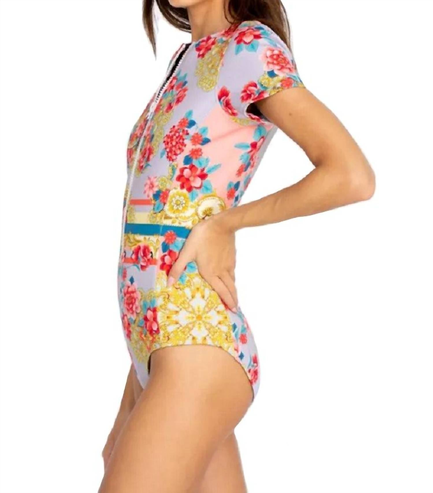 Designed to perfection and fit to flatter. You are going to love this one piece swimsuit.• 100% Neoprene• Zipper in front• Elastic in waistband• Measurements for size Medium: Length - 73 2/5", Bust - 39 7/10"Featuring a gorgeous floral print and short tapered sleeves, it also includes a large front zipper as a nice touch that makes a stylish statement.