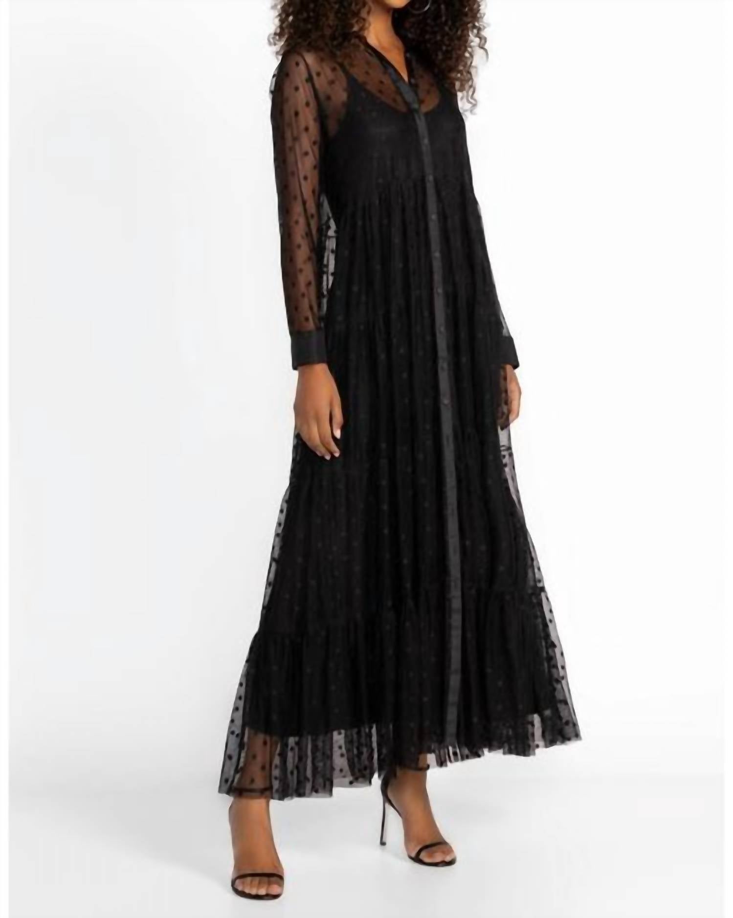 The Mazzy Shirtdress is made from lightweight, flowing fabric and draws inspiration from traditional men's shirting. It features a button-down front and a structured shoulder line and is fully slip-lined. This dress is elegantly finished with delicately placed embroidery and a tiered maxi skirt. Pair it with classic pumps and subtle jewelry for a polished evening look.