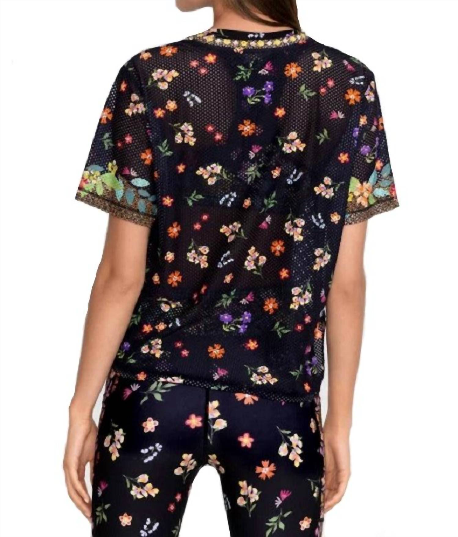 Crafted from a moisture-wicking material with a hint of stretch, this tee is cut in a comfortable oversized fit and boasts a round neck, short sleeves, a cropped hem, and a colorful bouquet of fresh flowers. Moisture Wicking. Shrink Resistant. Measurements for Size Medium: Bust- 43 1/2", Length- 24 1/2". 86% Polyester 14% Elastane. Imported. Machine Wash. Fade Resistant. Do no bleach. Tumble dry low. Cool iron if needed. Do not dry clean.