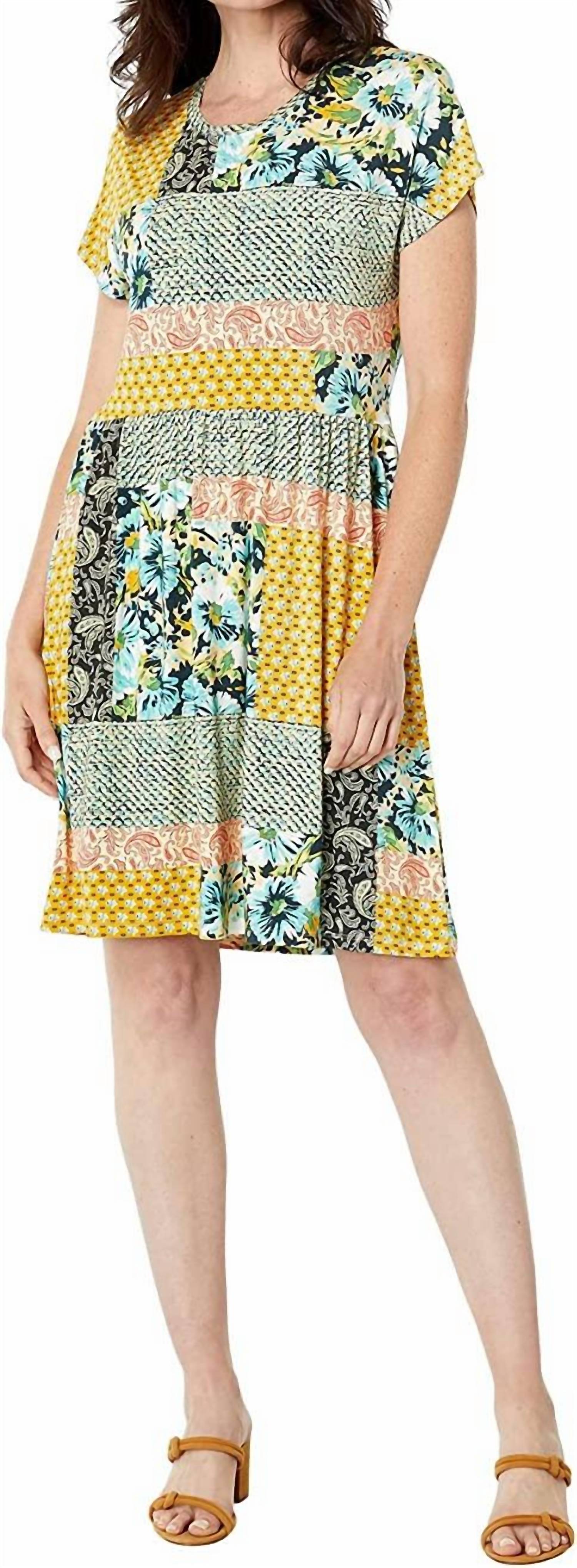 The perfect mini dress for those warmer months.Relaxed T-shirt dress. Mixing colors and motifs with its patchwork-inspired print. Model is wearing a size Small. Measurements for a Size Medium: Length- 36 1/2", Bust- 37 1/2". Machine Wash Cold.