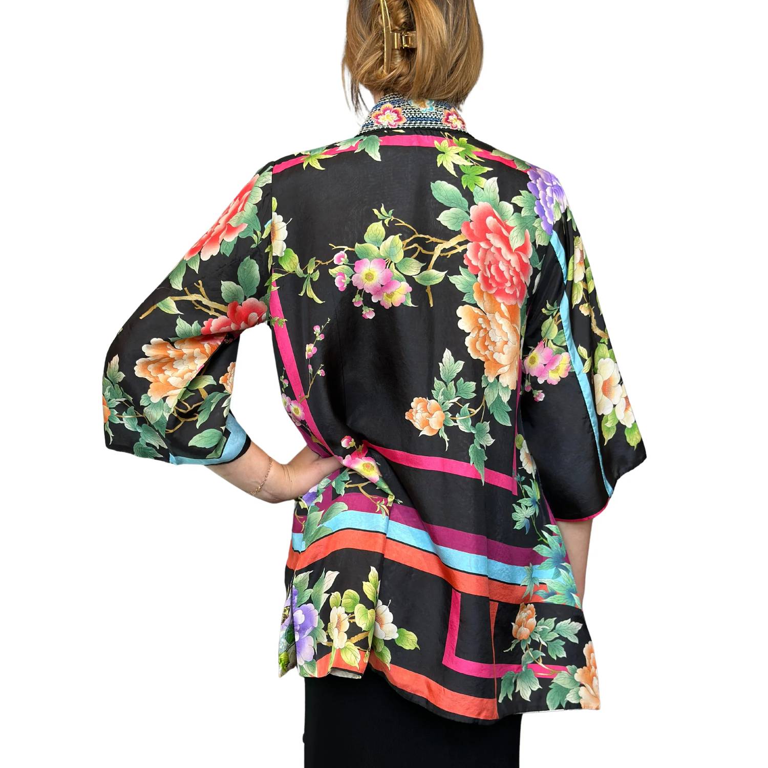 A classic fit that works just as good buttoned as it does left open. Experience the elegance of the Reversible Yena Kimono by Johnny Was, crafted from luxurious 100% silk. Featuring three-quarter sleeves, this kimono offers a unique twist with its fully reversible design showcasing two distinctive floral patterns in the Le Jardin Scarf Print. Boasting a relaxed fit, it includes a snap-front closure for easy styling. Care instructions: Hand wash and lay flat to dry. Measurements for size Medium: Length - 32", Bust 45".