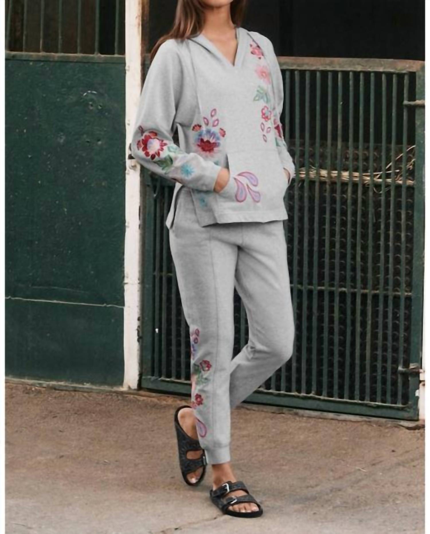 The Seamed Joggers are made from 100% cotton and provide comfort and a casual style. They feature an elastic waistband with a drawstring for an adjustable fit and hip pockets. The joggers are beautifully adorned with colorful floral embroidery.