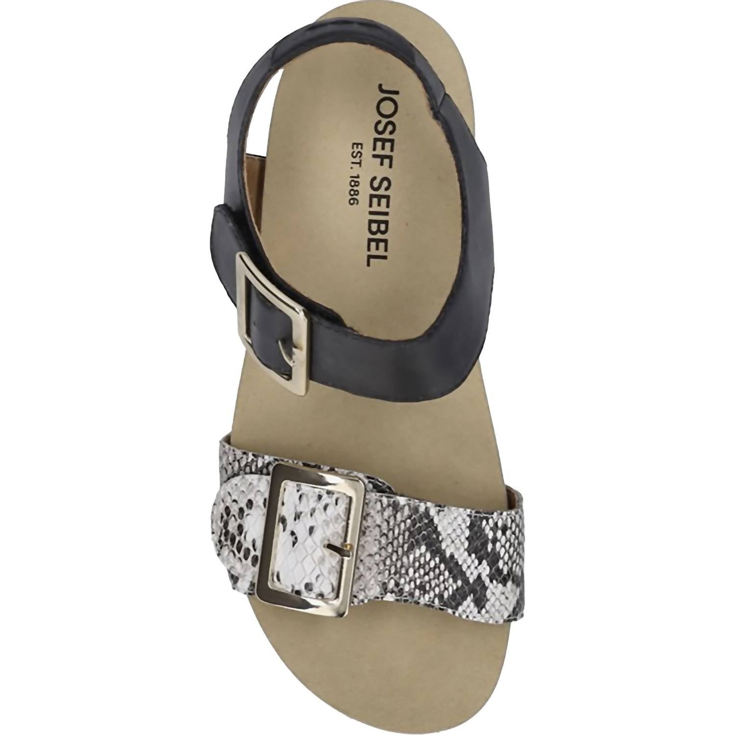 Elevate your footwear game with these adorable wedges. Step into summer style with the Women's Quinn 02 Wedge Sandal by Josef Seibel in chic Black Snake. Crafted from full-grain leather, this sandal features a contemporary open toe and a flexible forefoot wedge heel, perfect for beach days. The adjustable hook-and-loop straps and super soft, padded, and contoured footbed ensure a comfortable fit, while the cork/latex composite mid-sole offers lightweight support. Ideal for adults embracing 90s fashion trends, these sandals are a must-have for any warm-weather occasion.