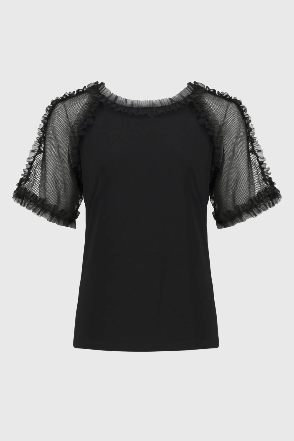 Pair this with your favorite jeans and slides for your next girls night out. Elevate your wardrobe with the Silky Knit and Mesh Top by Joseph Ribkoff, a chic and romantic piece in classic black. Crafted with short puff sleeves and a fitted hip-length design, it features a luxurious blend of 96% polyester and 4% spandex. This women's blouse is a pullover style, offering a seamless and elegant fit. Length: 24 inches. Hand wash and lay flat to dry to maintain its exquisite details.