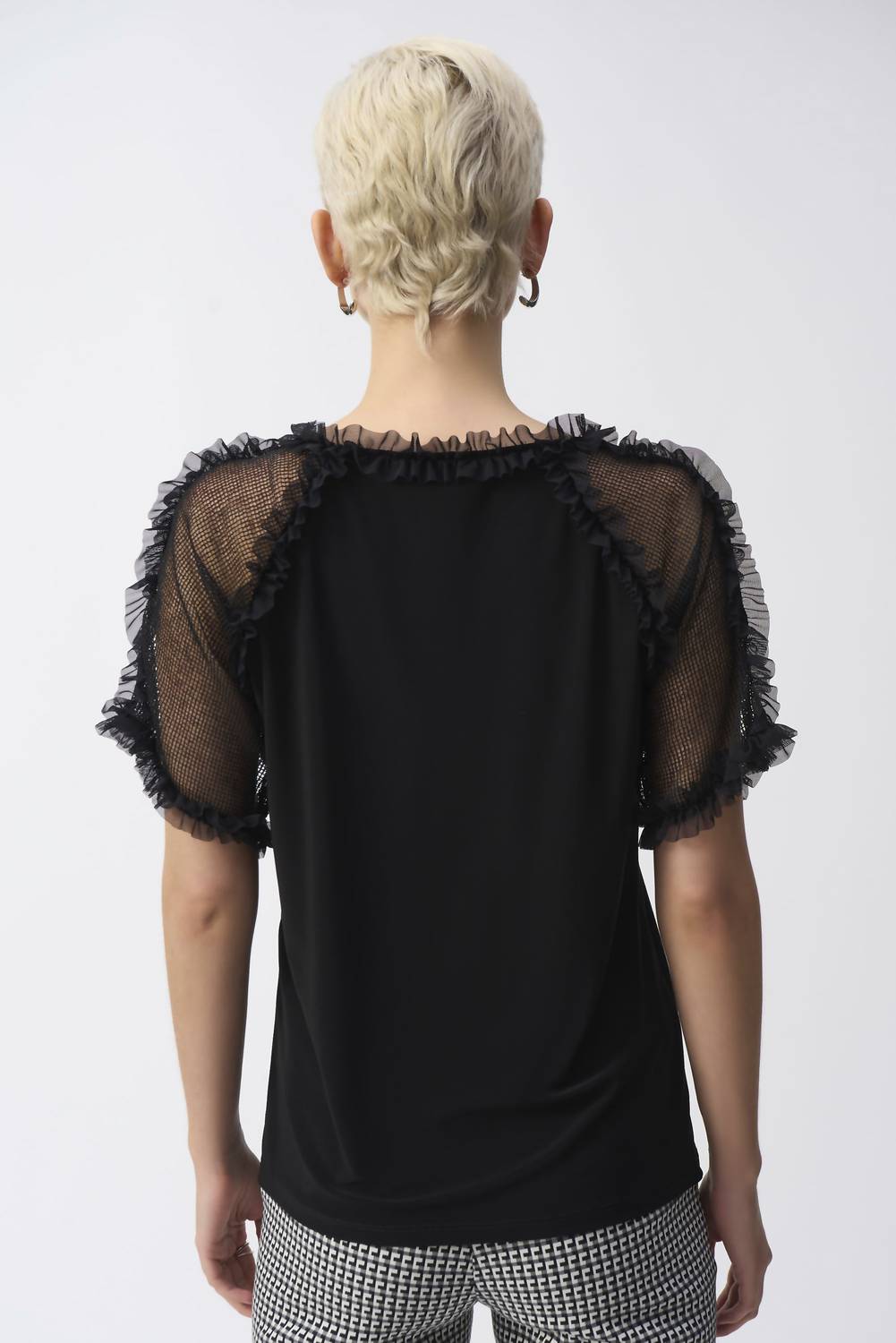 Elevate your wardrobe with the Silky Knit and Mesh Top by Joseph Ribkoff, a chic and romantic piece in classic black. Crafted with short puff sleeves and a fitted hip-length design, it features a luxurious blend of 96% polyester and 4% spandex. This women's blouse is a pullover style, offering a seamless and elegant fit. Length: 24 inches. Hand wash and lay flat to dry to maintain its exquisite details.