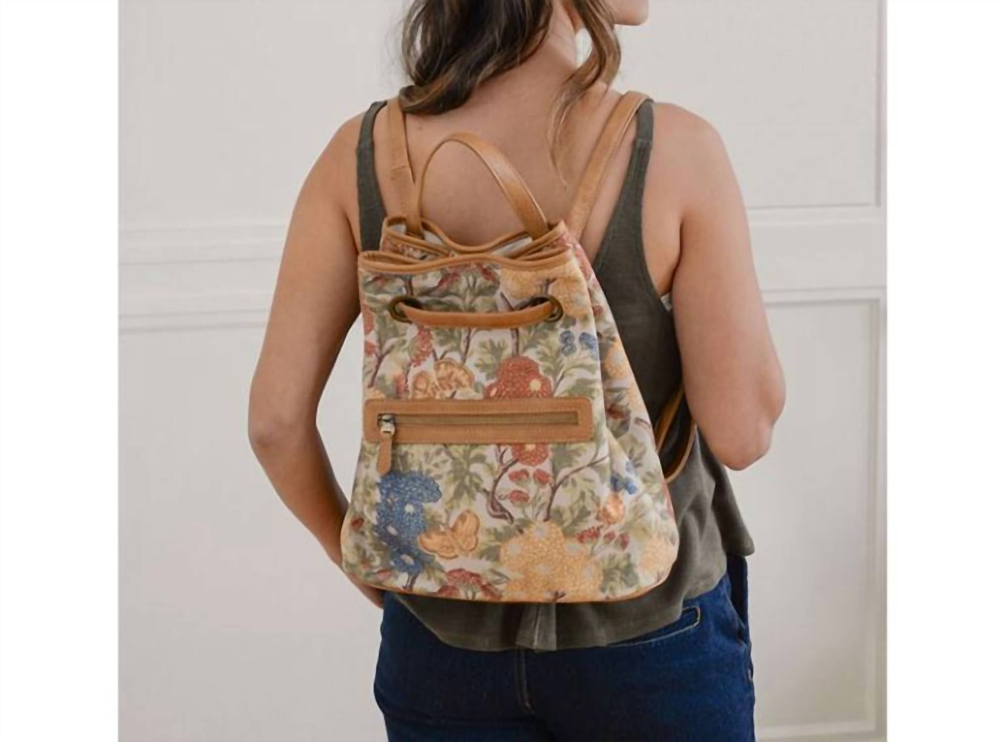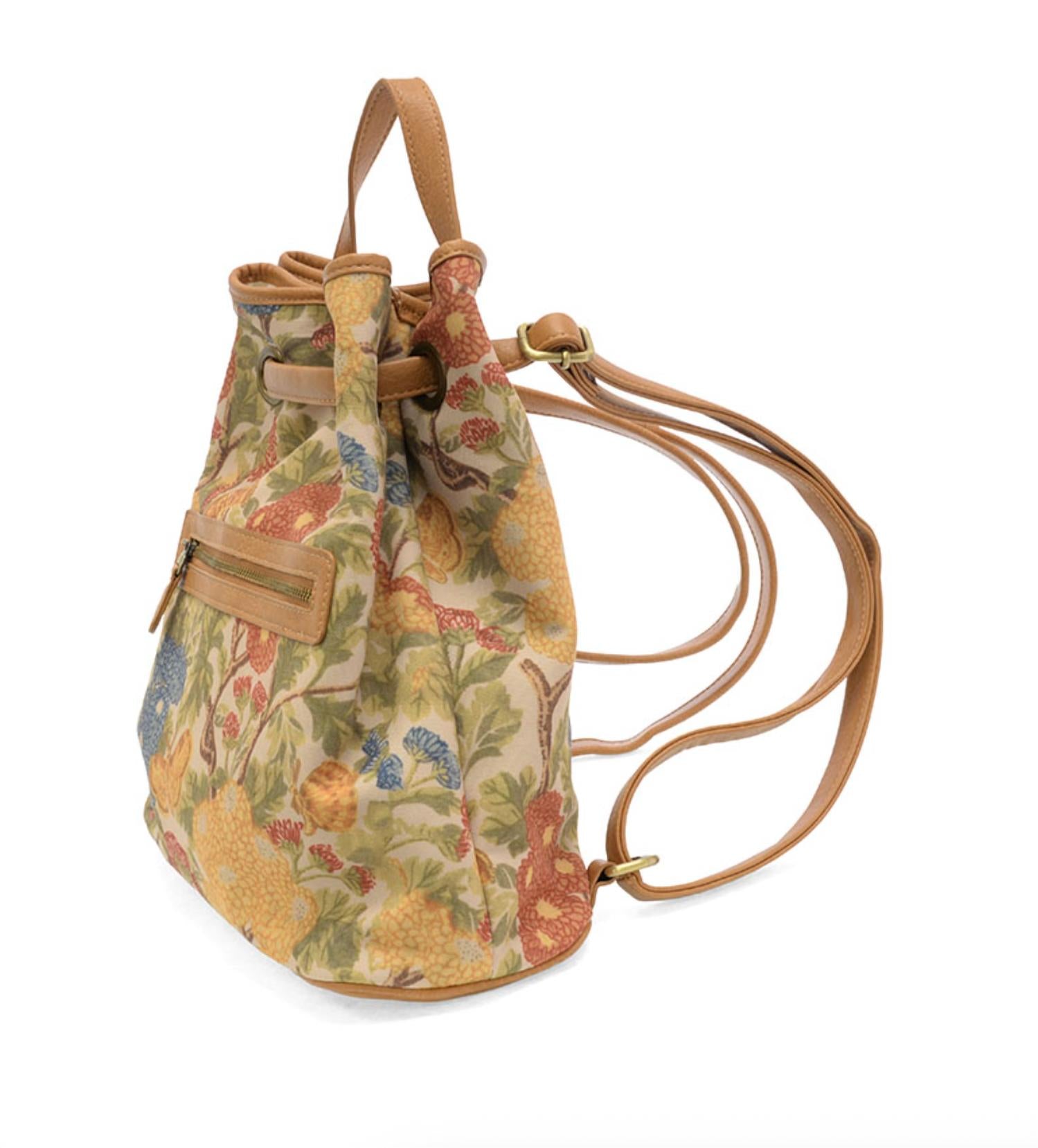 Not only functional, this backpack is stylish and fits everything you need in one place. It's a win-win! Elevate your beach style with the Women's Memphis Canvas Backpack by Joy Susan, available in a refreshing Botanical Floral print. This durable backpack is crafted from cotton canvas with 100% vegan leather trim and features dimensions of 13 inches high, 12 inches wide, and 5 inches deep. It offers ample space with a draw closure and multiple zipper pockets for convenience. Enjoy the comfort of adjustable shoulder straps and the elegance of brass-plated hardware.