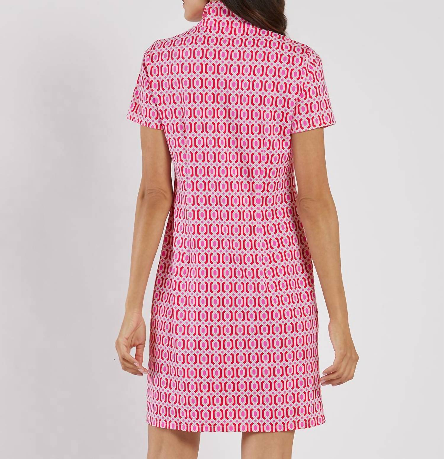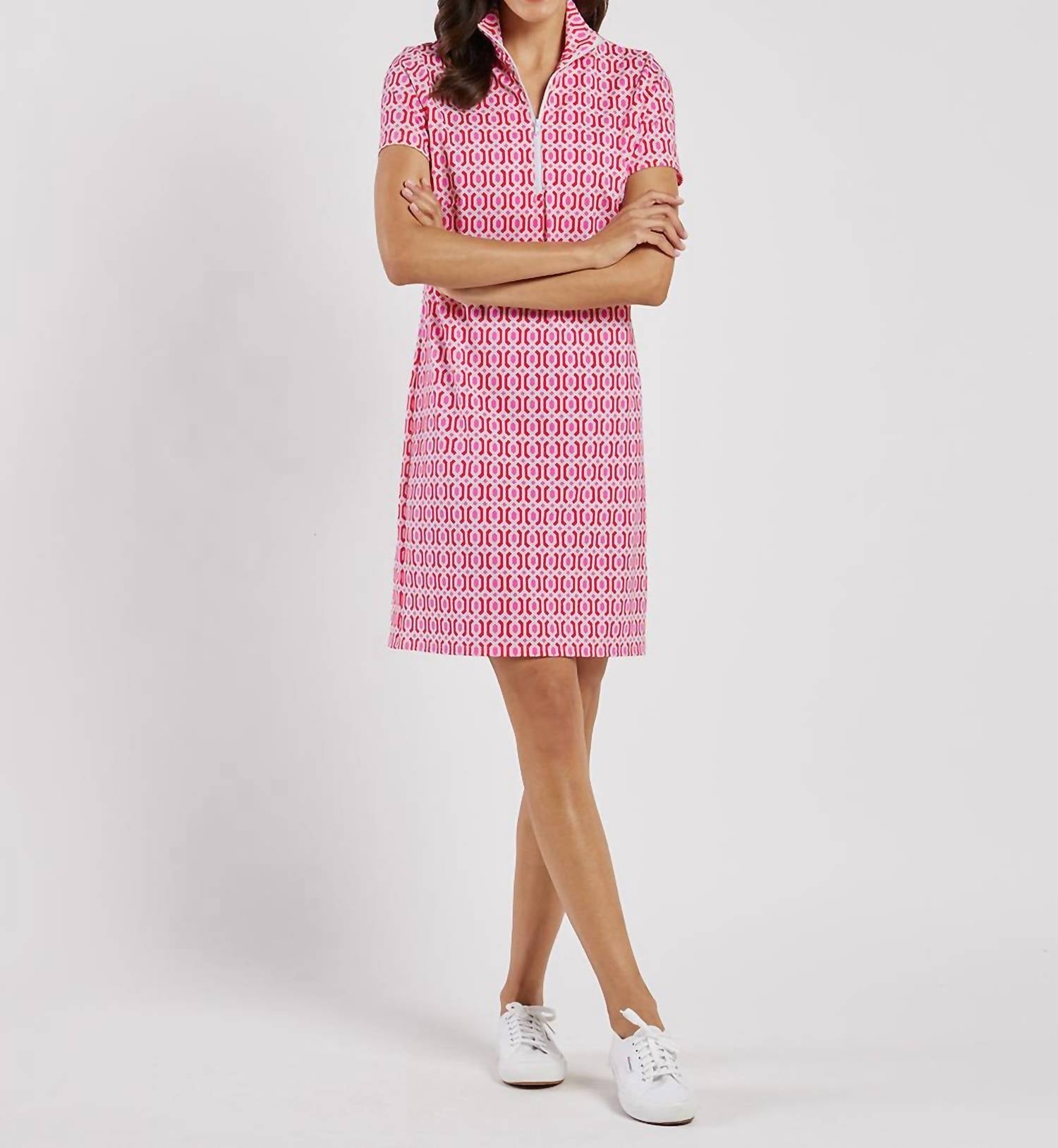 The perfect mini dress for those warmer months. Introducing the Alexia Short Sleeve Mini Dress by Jude Connally, a chic addition to your wardrobe with its figure-flattering design. Crafted from the brand's signature Jude Cloth fabric, this dress offers a geometric pattern in Terrace Geo Peony Pink, exuding minimalist style. With a comfortable slim fit, it features a short sleeve and a sporty quarter zip closure, measuring 35 1/2" from the top of the center back in size small. Made in the USA, this shift silhouette dress is easy to care for; simply machine wash and line dry.
