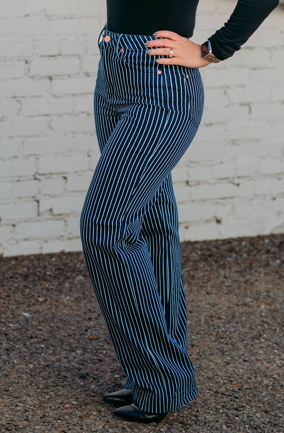 Fit to perfection, we love these high-waist jeans and you will too. Elevate your wardrobe with the Women's High Waist Striped Jeans by Judy Blue. These stylish blue jeans boast a flattering comfort fit and a high-rise waist, ensuring both fashion-forward appeal and comfortable wear. Characterized by their chic striped pattern, these jeans feature a straight leg design and practical pockets for added convenience. Complete with a button closure, they are the perfect blend of trend and practicality for your everyday looks.