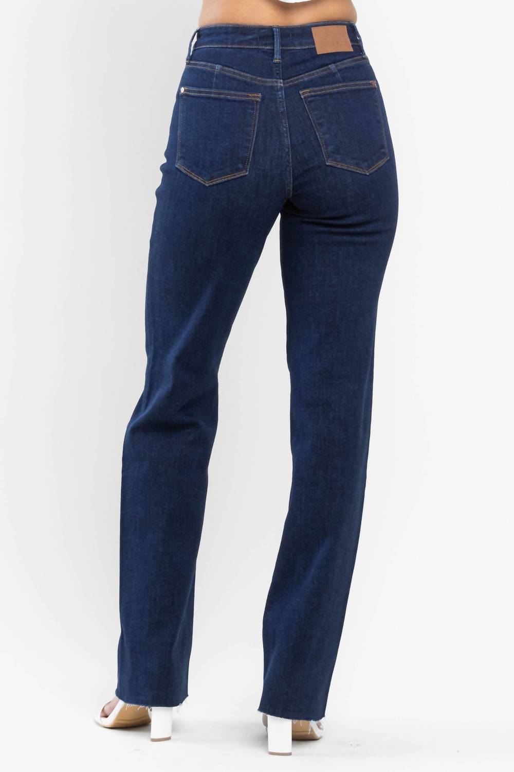Introducing the Judy Blue High Waist Vintage & Back Darts Detail Straight Denim Jeans, designed to provide a flattering straight up-and-down fit through the entire leg. Made from a blend of 69% Cotton, 16% Polyester, 9% Rayon, 5% Elastel-Poly, and 1% Spandex, this high-rise denim promises comfort with flexibility. Featuring a front rise of 10.75 inches and a generous inseam of 33 inches, these jeans are completed with a classic button closure. For best care, turn inside out, wash in cold water, and air dry or tumble on low to maintain their quality and vibrant dark wash.